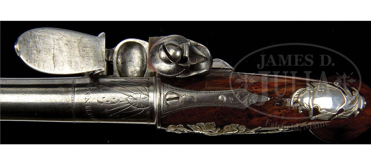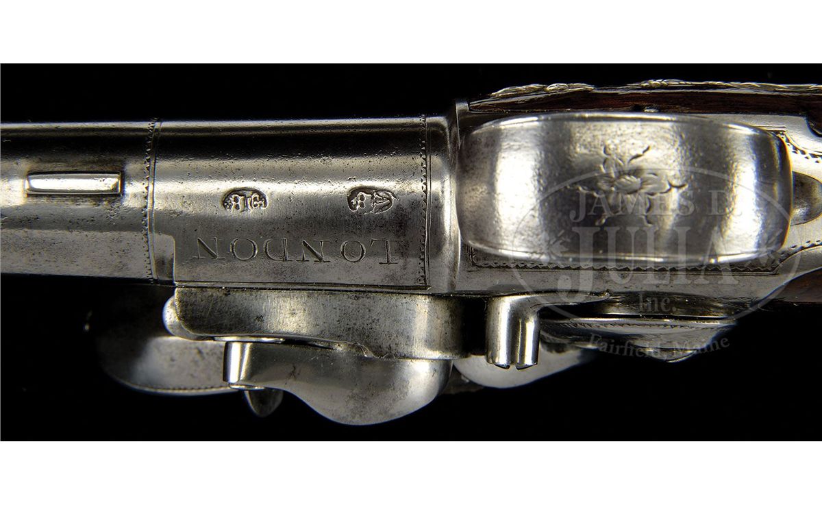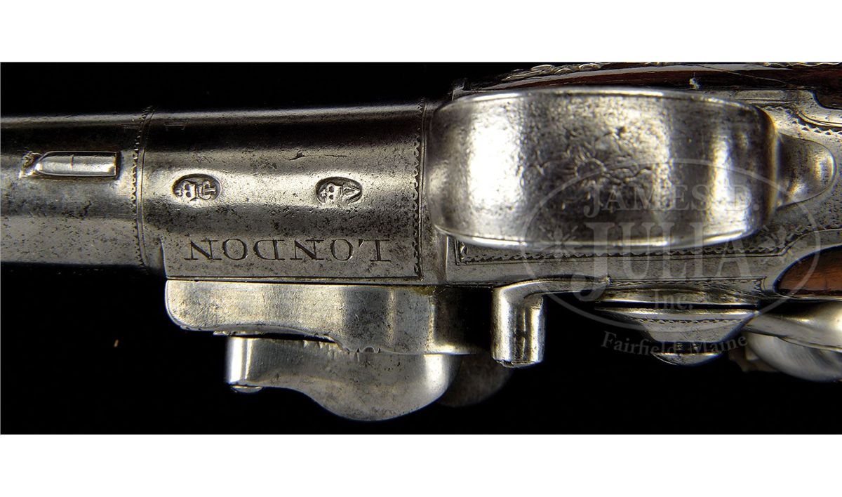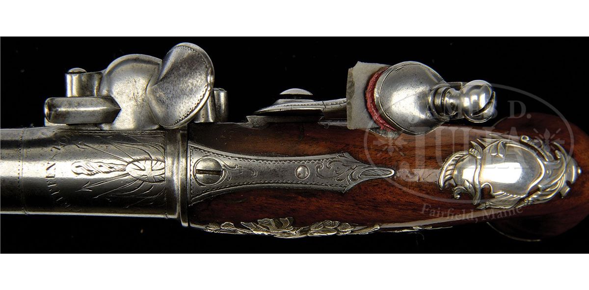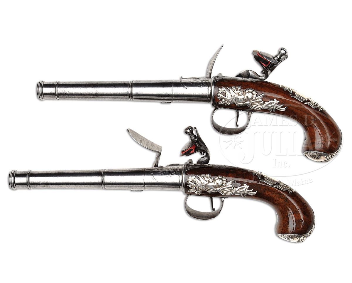 NSN. Cal. .580 Bore diameter. 5-1/2" Cannon bbls mount to boxlock breeches, with armorial engraving on tops, along with "GRIFFIN & TOW" (1768-1779). Bottoms are engraved "LONDON", and stamped with gunmakers proofs. Non-waterproof pans extend to form bridles for friction frizzens, with nicely filed, long tailed frizzen springs, which mount in front of round bodied, serpentine cocks. Iron trigger guards have floral engraving. Walnut stocks with modified birds head grips, are mounted with exceptionally fine, relief cast, hallmarked silver furniture ("I K", John King). Butt caps are of relief acanthus scroll surrounding seated angel blowing horn (Gabriel ?). Escutcheons are armorial style with helmet at top and flag and cannon bbls at bottom. Sideplates also portray stand-of-arms with cannons, flags, and spears. Pistols measure 12" overall. PROVENANCE: Warren Moore Collection. These pistols are pictured and described in the "Roll of Honor" in MAN AT ARMS, vol. 32 no. 6, 2010, and are also pictured on p. 28 of WEAPONS OF THE AMERICAN REVOLUTION, copyright 1967. CONDITION: Very fine. Iron and steel parts are cleaned to a silver gray patina. Silver furniture is excellent with little wear. Stocks retain most of an old varnish finish. Cock of one pistol is broken at old repair. 4-49673 MGM276