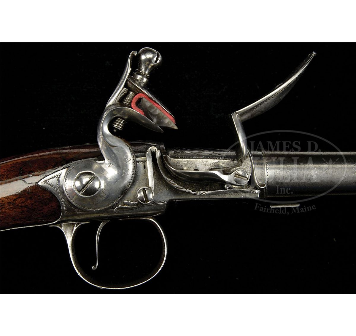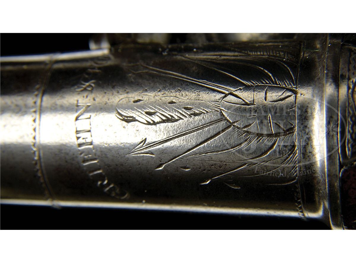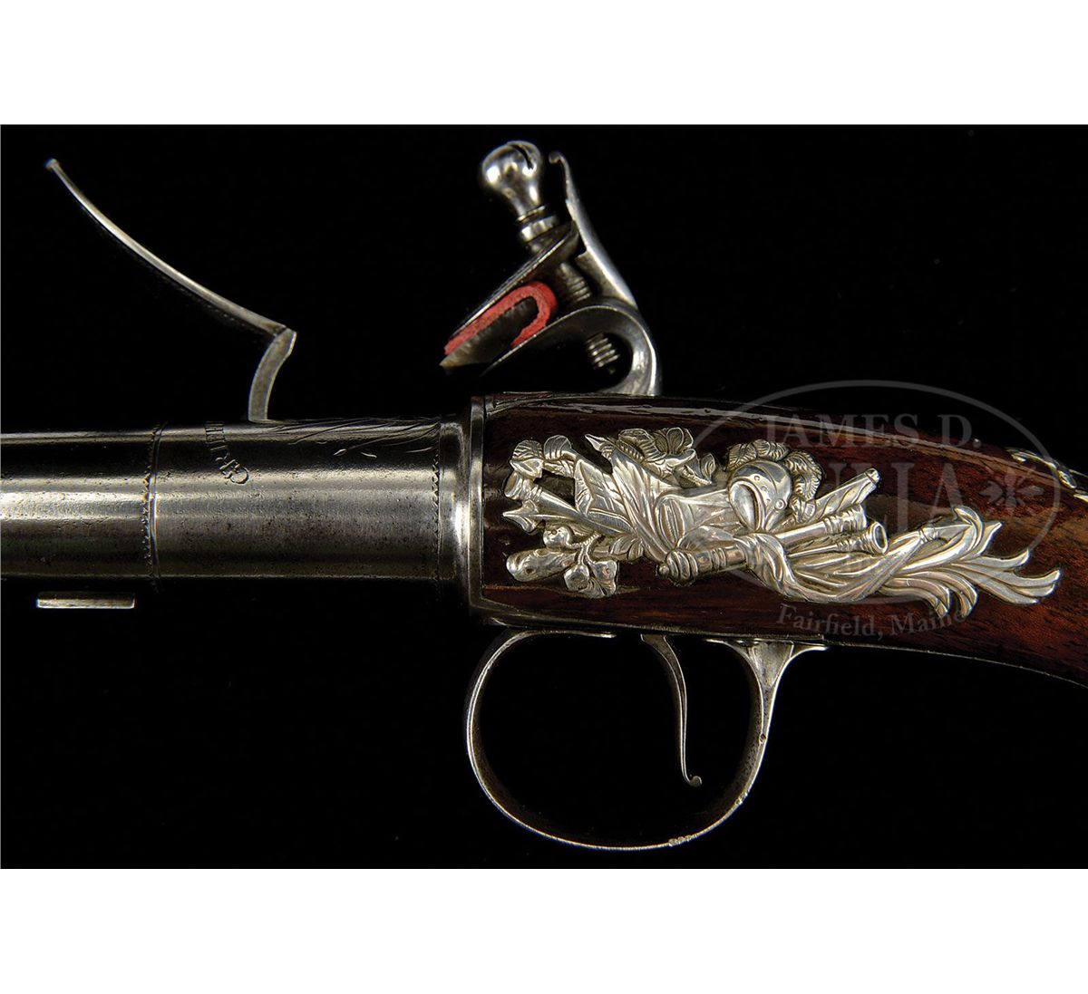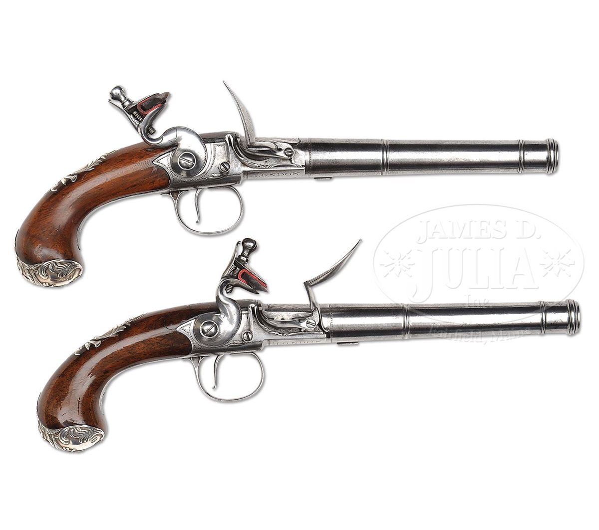 NSN. Cal. .580 Bore diameter. 5-1/2" Cannon bbls mount to boxlock breeches, with armorial engraving on tops, along with "GRIFFIN & TOW" (1768-1779). Bottoms are engraved "LONDON", and stamped with gunmakers proofs. Non-waterproof pans extend to form bridles for friction frizzens, with nicely filed, long tailed frizzen springs, which mount in front of round bodied, serpentine cocks. Iron trigger guards have floral engraving. Walnut stocks with modified birds head grips, are mounted with exceptionally fine, relief cast, hallmarked silver furniture ("I K", John King). Butt caps are of relief acanthus scroll surrounding seated angel blowing horn (Gabriel ?). Escutcheons are armorial style with helmet at top and flag and cannon bbls at bottom. Sideplates also portray stand-of-arms with cannons, flags, and spears. Pistols measure 12" overall. PROVENANCE: Warren Moore Collection. These pistols are pictured and described in the "Roll of Honor" in MAN AT ARMS, vol. 32 no. 6, 2010, and are also pictured on p. 28 of WEAPONS OF THE AMERICAN REVOLUTION, copyright 1967. CONDITION: Very fine. Iron and steel parts are cleaned to a silver gray patina. Silver furniture is excellent with little wear. Stocks retain most of an old varnish finish. Cock of one pistol is broken at old repair. 4-49673 MGM276