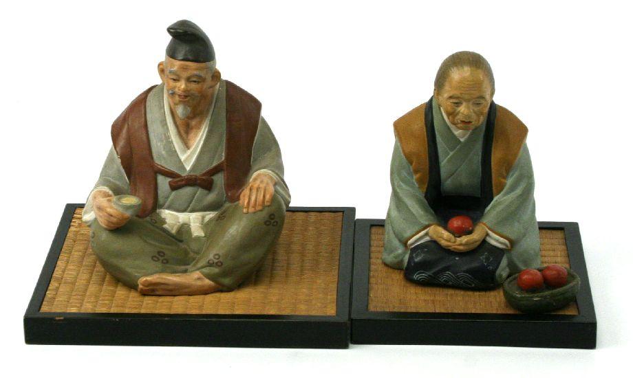 Lot of two seated men, circa 1949. One is a fruit vendor with basket of fruit and the other man is drinking from a small cup. Both include black lacquered base. Very good condition.