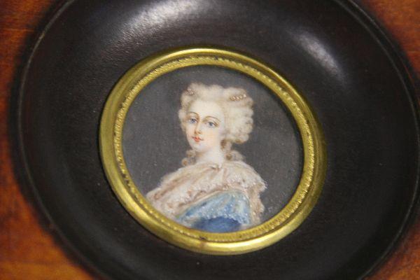 5x6 inch framed ivory portrait of composer Robert Schumann signed "Willy". 4.25x4.25 inches framed portrait of a 17th C maiden singed "F.L". Very good condition.