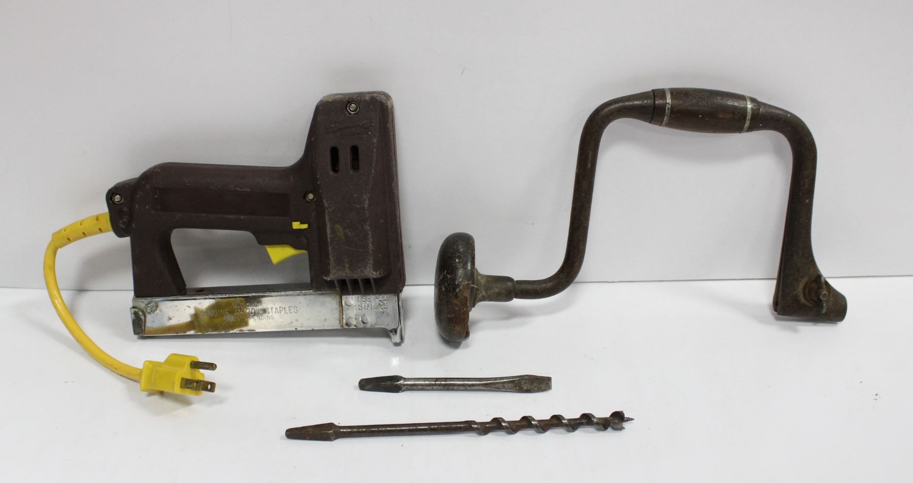 PAIR OF HAND TOOLS - NAILGUN + VINTAGE HAND DRILL