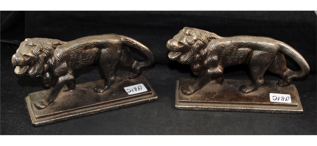 PAIR OF HEAVEY METAL LION BOOKENDS - 6 1/2" IN LENGTH, 3 1/2" TALL