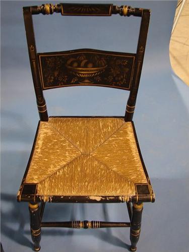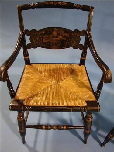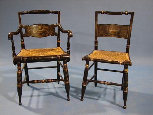 PAIR OF HITCHCOCK CHAIRS. Consists of one arm chair & side chair. Rush bottom seats. Black & gilt painted with gilt stenciled decoration of fruit at back splats. Both are marked on reverse. 33.5” H to top of back.