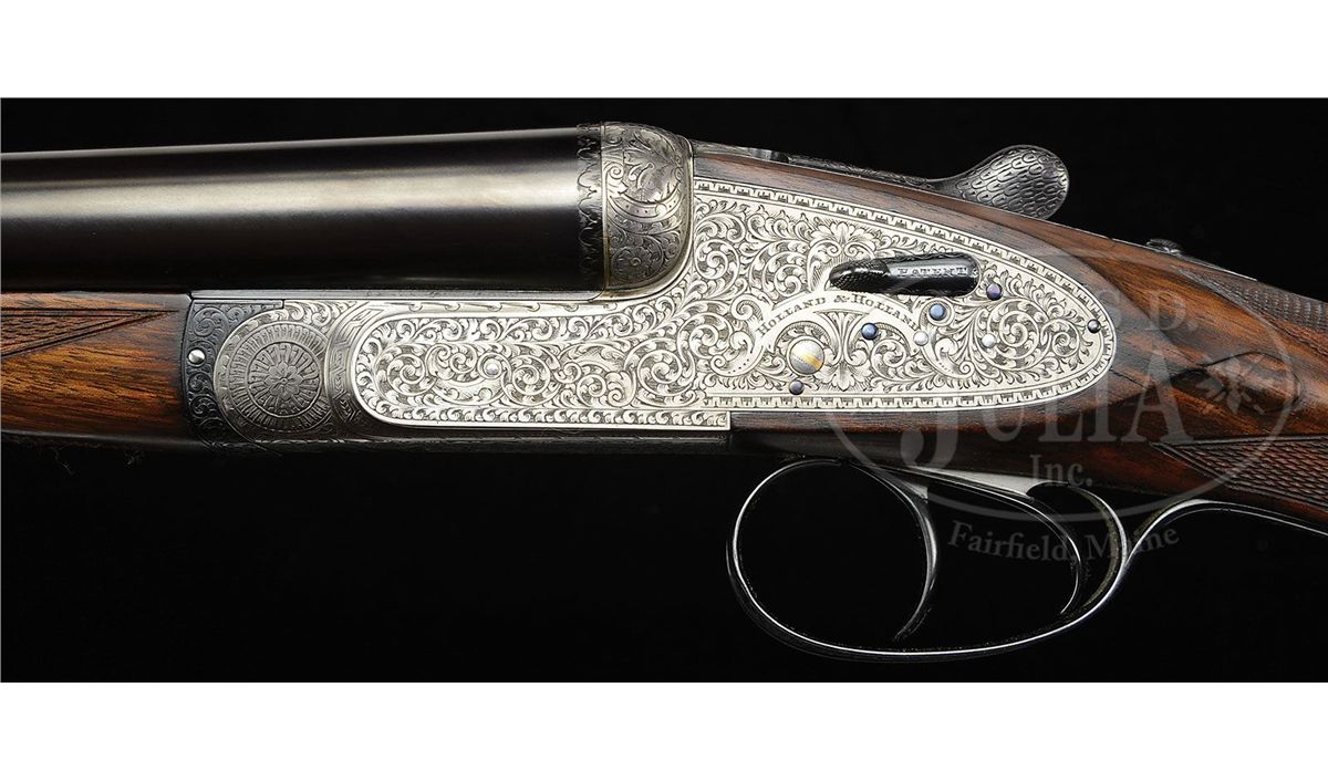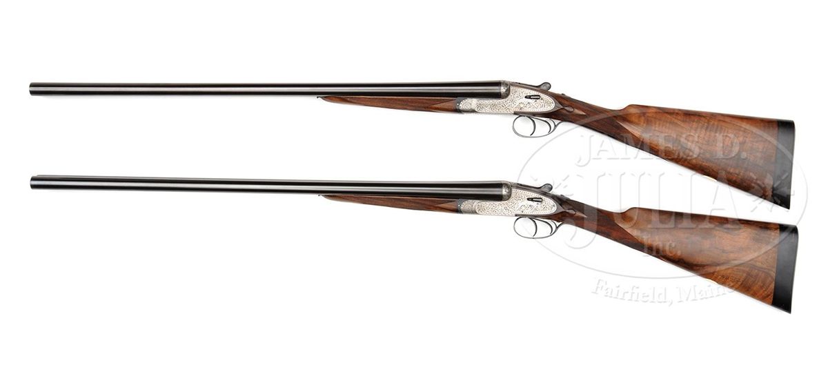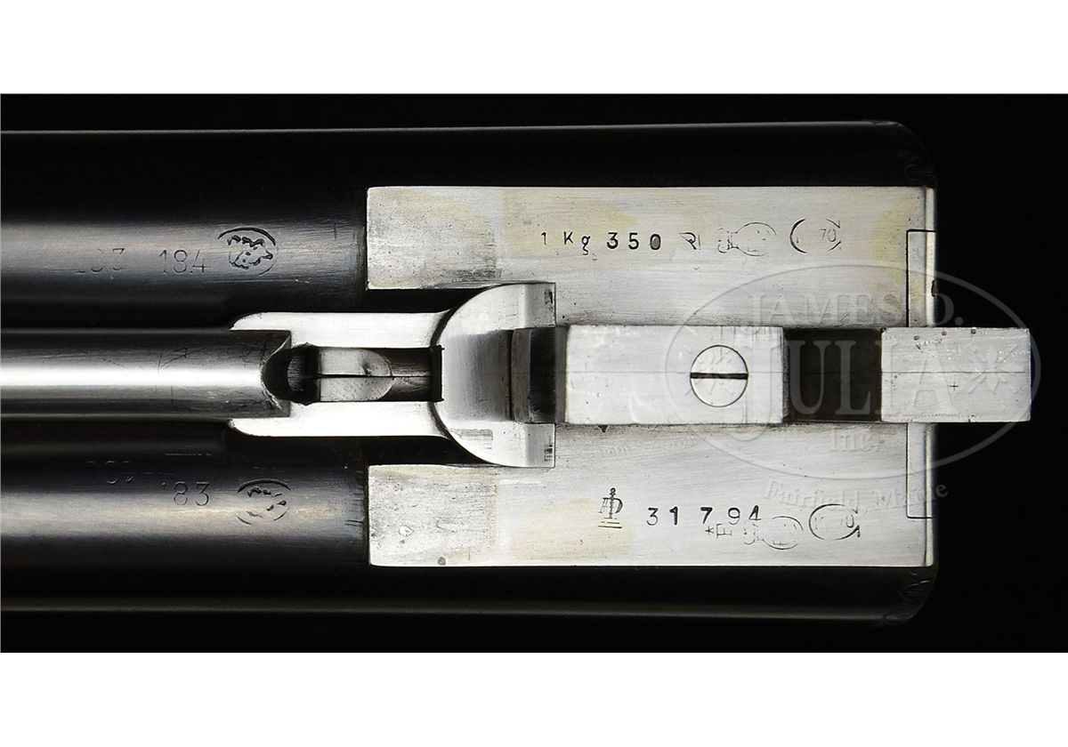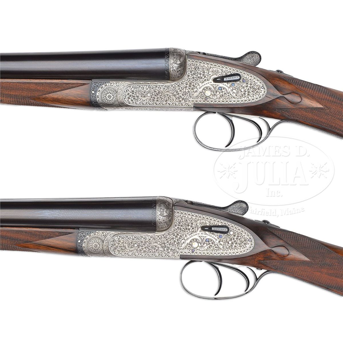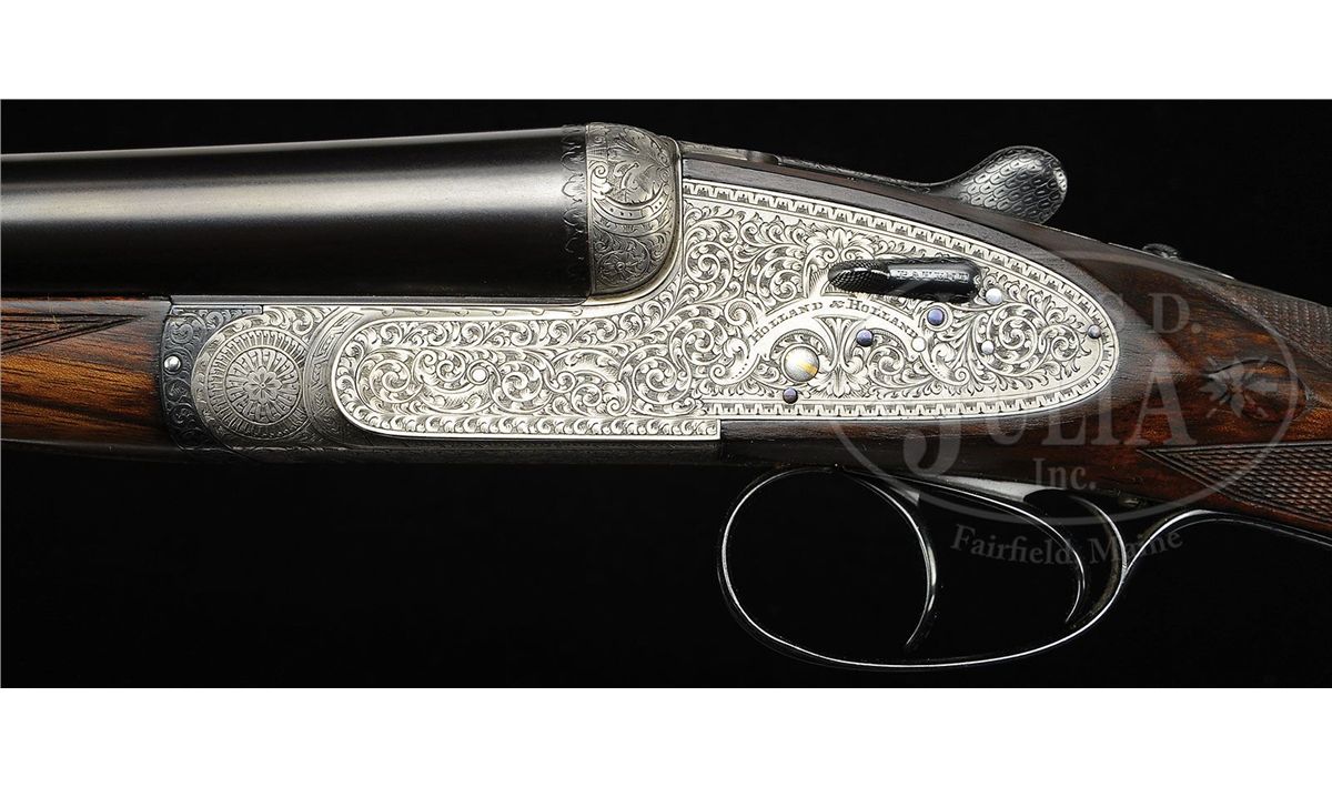 SN 31794/ 31795. (1928) Cal. 12 ga. 3" Chambers. 27-3/4" Chopper lump bbls are unmarked with the exception of gold numbers "1" and "2" at breech ends of narrow game ribs. (These numbers also appear on top levers and forend tips.) Bbl flats are stamped with Belgian nitro proofs for 2-3/4" chambers. Bbls are fitted with Holland and Holland patent self-opening assist springs. Classic Royal actions feature non-automatic safeties (SAFE inlaid in gold), double triggers, gold band tumbler end cocking indicators, and H & H patent detachable sidelocks. Actions and lockplates are engraved in classic H & H house style with large open shaded scroll with acanthus highlights. "Holland & Holland" is in arched device on each lockplate. Bottoms of actions are engraved "ROYAL" "SELF-OPENER" "PATENT 1922". Single beaded trigger guards are engraved with open scroll and SNs at grips. well matched, lightly figured and well marbled European walnut straight grip buttstocks measure 15-1/4" over 1-1/4" thick checkered horn buttplates, and feature point pattern checkering with line borders, drop points, and vacant gold ovals on toe lines. Matching splinter ejector forends have Anson releases. Gun no. "1": Bore diameter: left-.724, right -.719. Bore restrictions: left -.032 (Full), right -.013 (Lt Mod). Wall thickness: left -.032, right -.032. Drop at heel: 2-3/8", drop at comb: 1-7/16". Weight: 6 lbs. 12 oz. LOP: 15-1/4". Gun no. "2": Bore diameter: left-.727, right -.727. Bore restrictions: left -.015 (Lt Mod), right -.007 (IC). Wall thickness: left -.025, right -.027. Drop at heel: 2-3/8", drop at comb: 1-7/16". Weight: 6 lbs. 11 oz. LOP: 15-1/4". PROVENANCE: Factory cover letter stating history of guns as known. CONDITION: Excellent, as completely refinished. Newly made high quality bbls retain nearly all of their orig satin blue finish. Actions coin finished. Top levers, forend irons and trigger guards re-blued, and retain most of that blue, engraving slightly softened. Stocks retain nearly all of their rubbed oil refinish, checkering re-cut. Horn butt extensions were most likely done at time of refinishing. Bores are excellent. Actions are tight. Bbls are on face. Ejectors of gun no. "1" are in time. Gun no. "2" ejectors are slightly out of time. A fine usable pair of classic game guns. 4-48281 MGM32