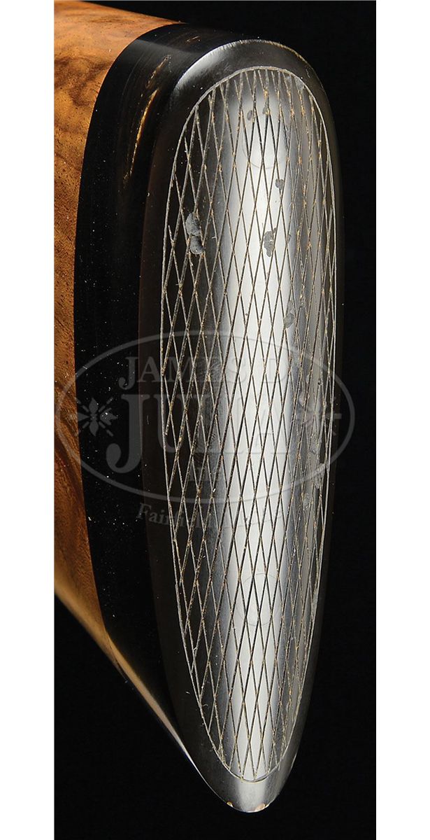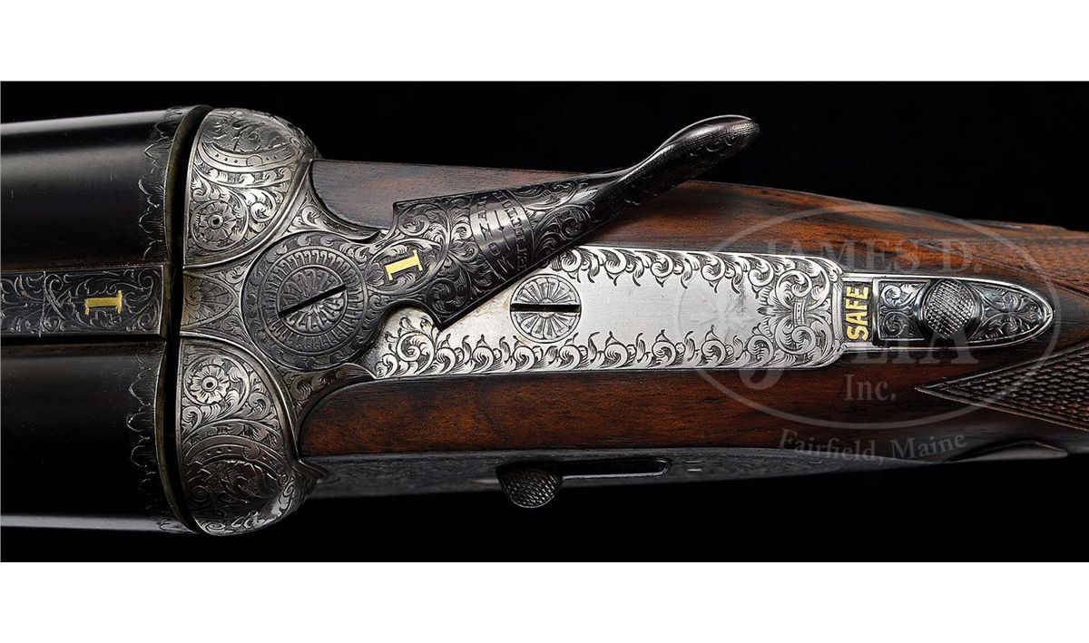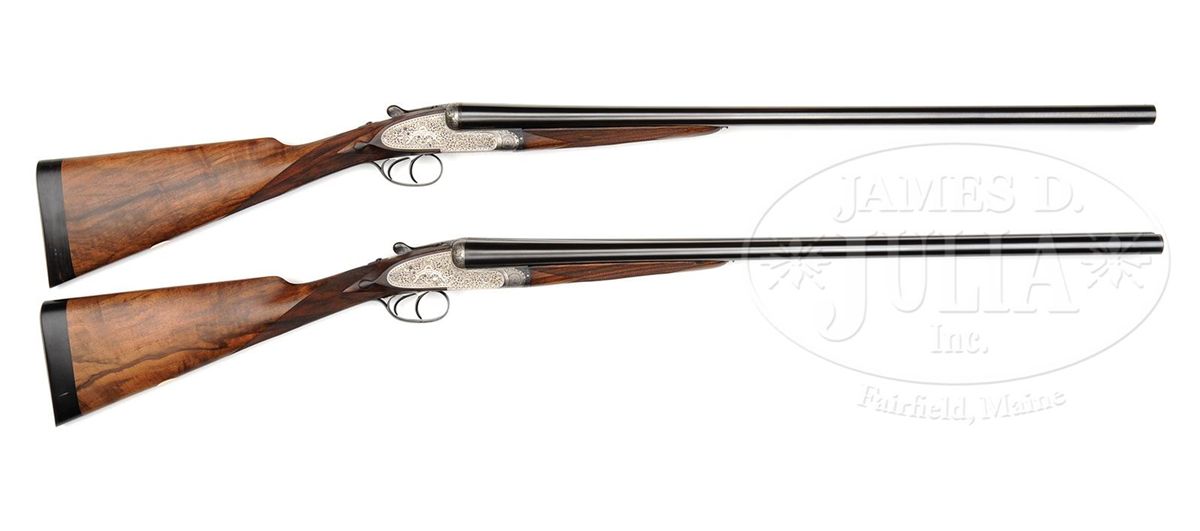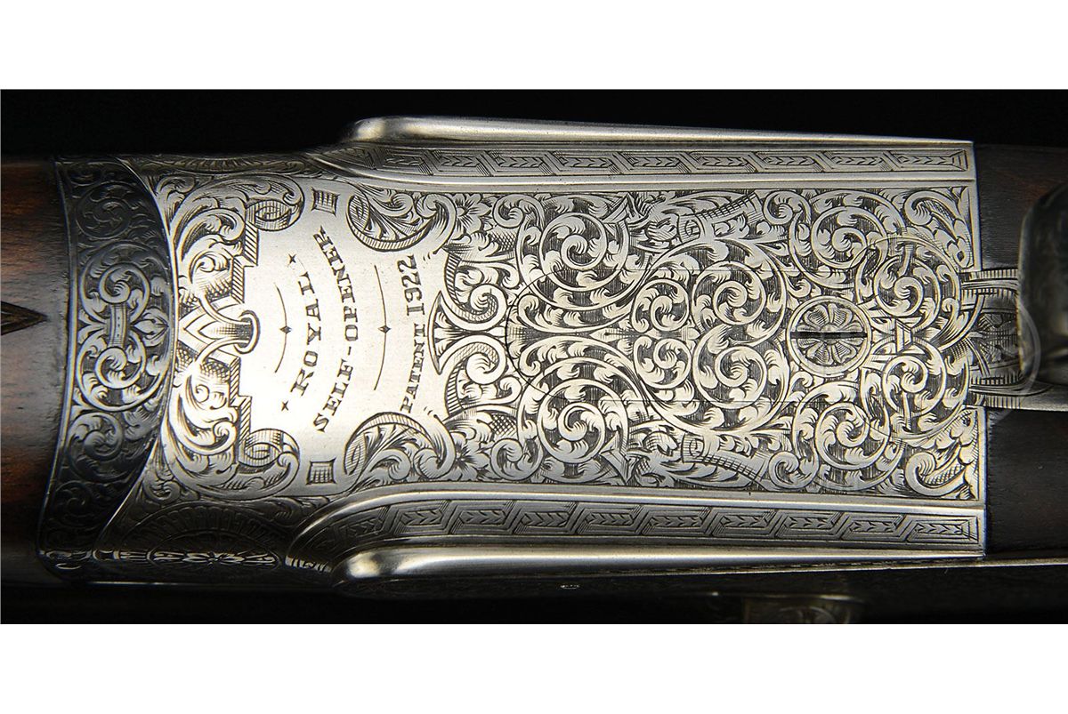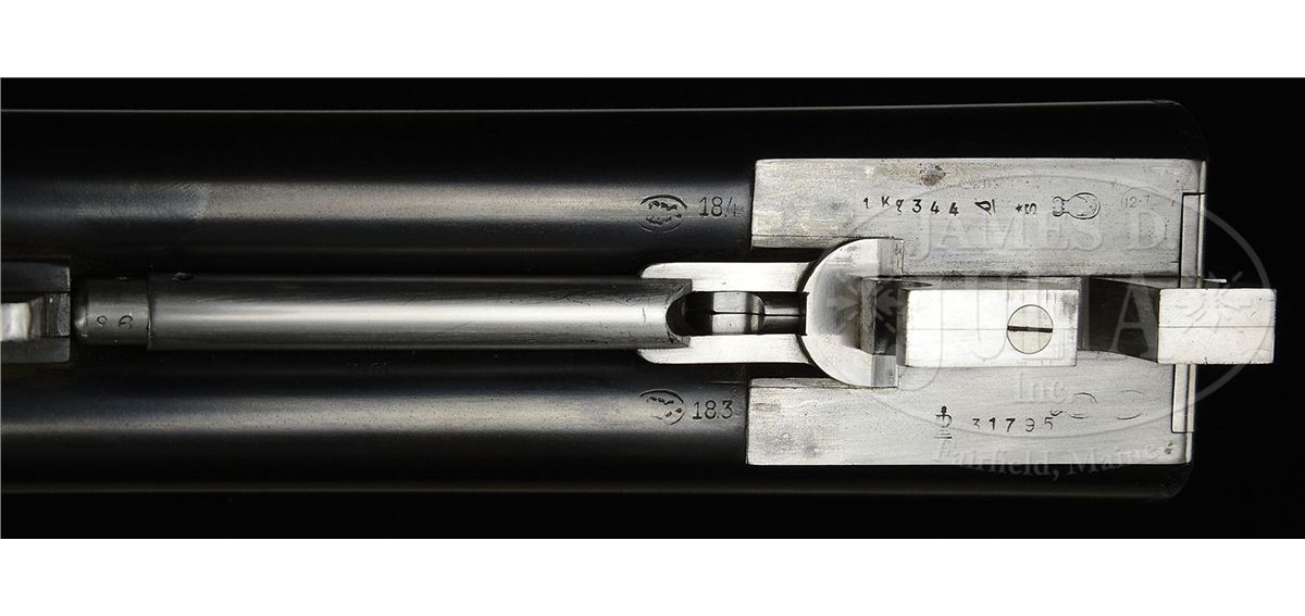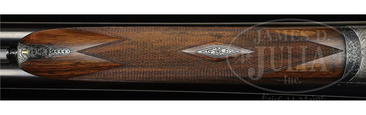 SN 31794/ 31795. (1928) Cal. 12 ga. 3" Chambers. 27-3/4" Chopper lump bbls are unmarked with the exception of gold numbers "1" and "2" at breech ends of narrow game ribs. (These numbers also appear on top levers and forend tips.) Bbl flats are stamped with Belgian nitro proofs for 2-3/4" chambers. Bbls are fitted with Holland and Holland patent self-opening assist springs. Classic Royal actions feature non-automatic safeties (SAFE inlaid in gold), double triggers, gold band tumbler end cocking indicators, and H & H patent detachable sidelocks. Actions and lockplates are engraved in classic H & H house style with large open shaded scroll with acanthus highlights. "Holland & Holland" is in arched device on each lockplate. Bottoms of actions are engraved "ROYAL" "SELF-OPENER" "PATENT 1922". Single beaded trigger guards are engraved with open scroll and SNs at grips. well matched, lightly figured and well marbled European walnut straight grip buttstocks measure 15-1/4" over 1-1/4" thick checkered horn buttplates, and feature point pattern checkering with line borders, drop points, and vacant gold ovals on toe lines. Matching splinter ejector forends have Anson releases. Gun no. "1": Bore diameter: left-.724, right -.719. Bore restrictions: left -.032 (Full), right -.013 (Lt Mod). Wall thickness: left -.032, right -.032. Drop at heel: 2-3/8", drop at comb: 1-7/16". Weight: 6 lbs. 12 oz. LOP: 15-1/4". Gun no. "2": Bore diameter: left-.727, right -.727. Bore restrictions: left -.015 (Lt Mod), right -.007 (IC). Wall thickness: left -.025, right -.027. Drop at heel: 2-3/8", drop at comb: 1-7/16". Weight: 6 lbs. 11 oz. LOP: 15-1/4". PROVENANCE: Factory cover letter stating history of guns as known. CONDITION: Excellent, as completely refinished. Newly made high quality bbls retain nearly all of their orig satin blue finish. Actions coin finished. Top levers, forend irons and trigger guards re-blued, and retain most of that blue, engraving slightly softened. Stocks retain nearly all of their rubbed oil refinish, checkering re-cut. Horn butt extensions were most likely done at time of refinishing. Bores are excellent. Actions are tight. Bbls are on face. Ejectors of gun no. "1" are in time. Gun no. "2" ejectors are slightly out of time. A fine usable pair of classic game guns. 4-48281 MGM32