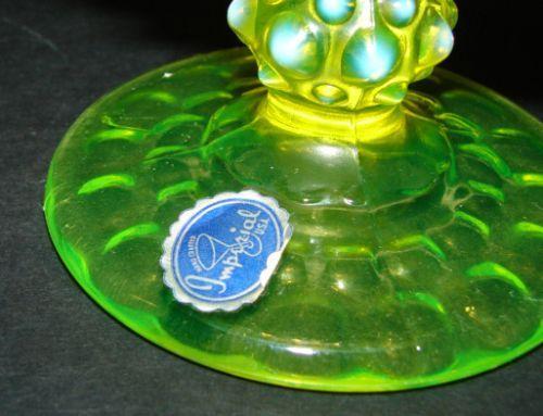 PAIR OF IMPERIAL GLASS CO. OPALESCENT VASELINE GLASS OPEN COMPOTES. Fluted tops. Hobnailed pattern. One compote has Imperial sticker at base. Compotes differ slightly in shade and diameter. 5” H