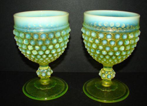PAIR OF IMPERIAL GLASS CO. OPALESCENT VASELINE GLASS GOBLETS. Hobnailed pattern. Marked on bottom with moulded Imperial mark. 5” H