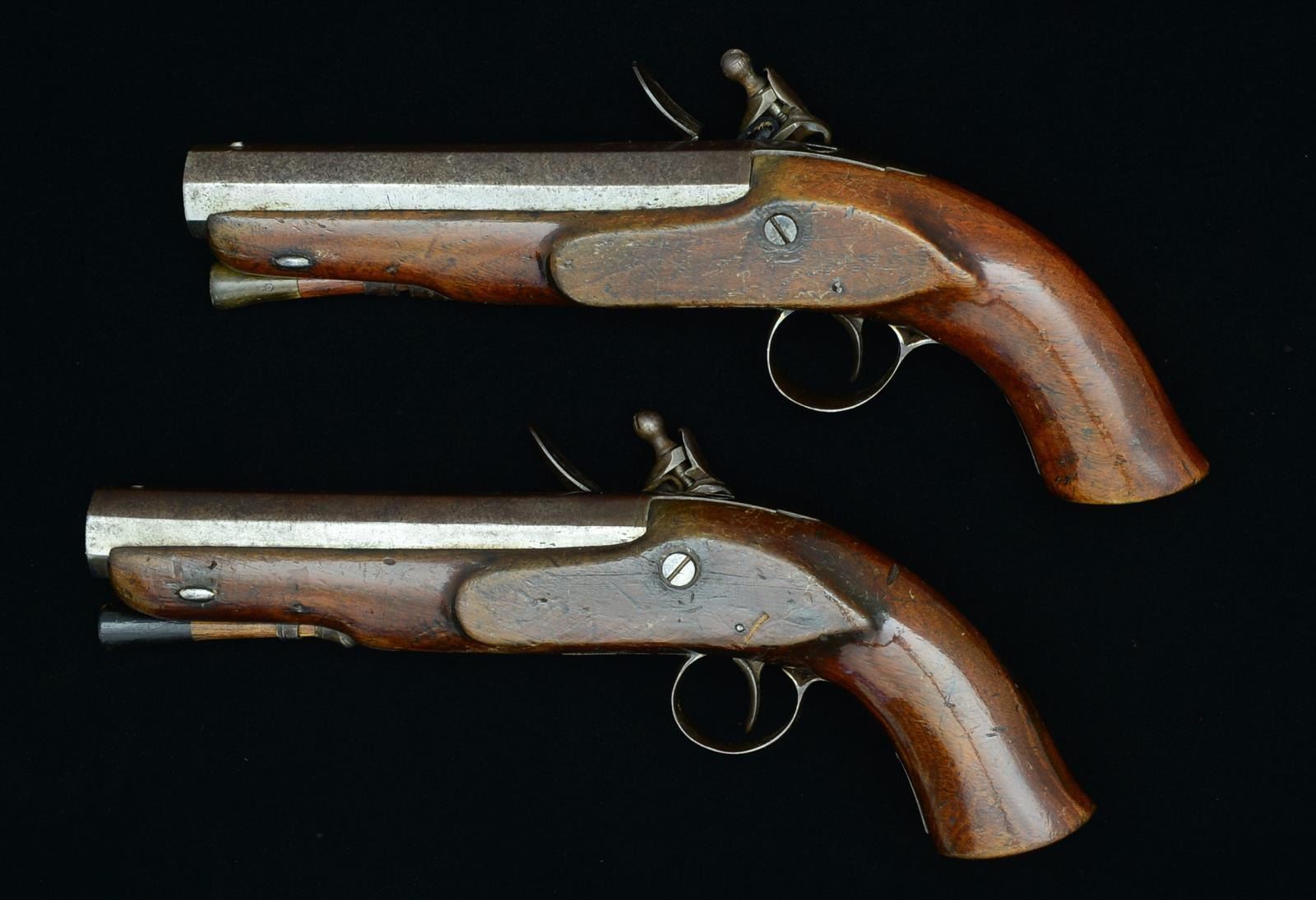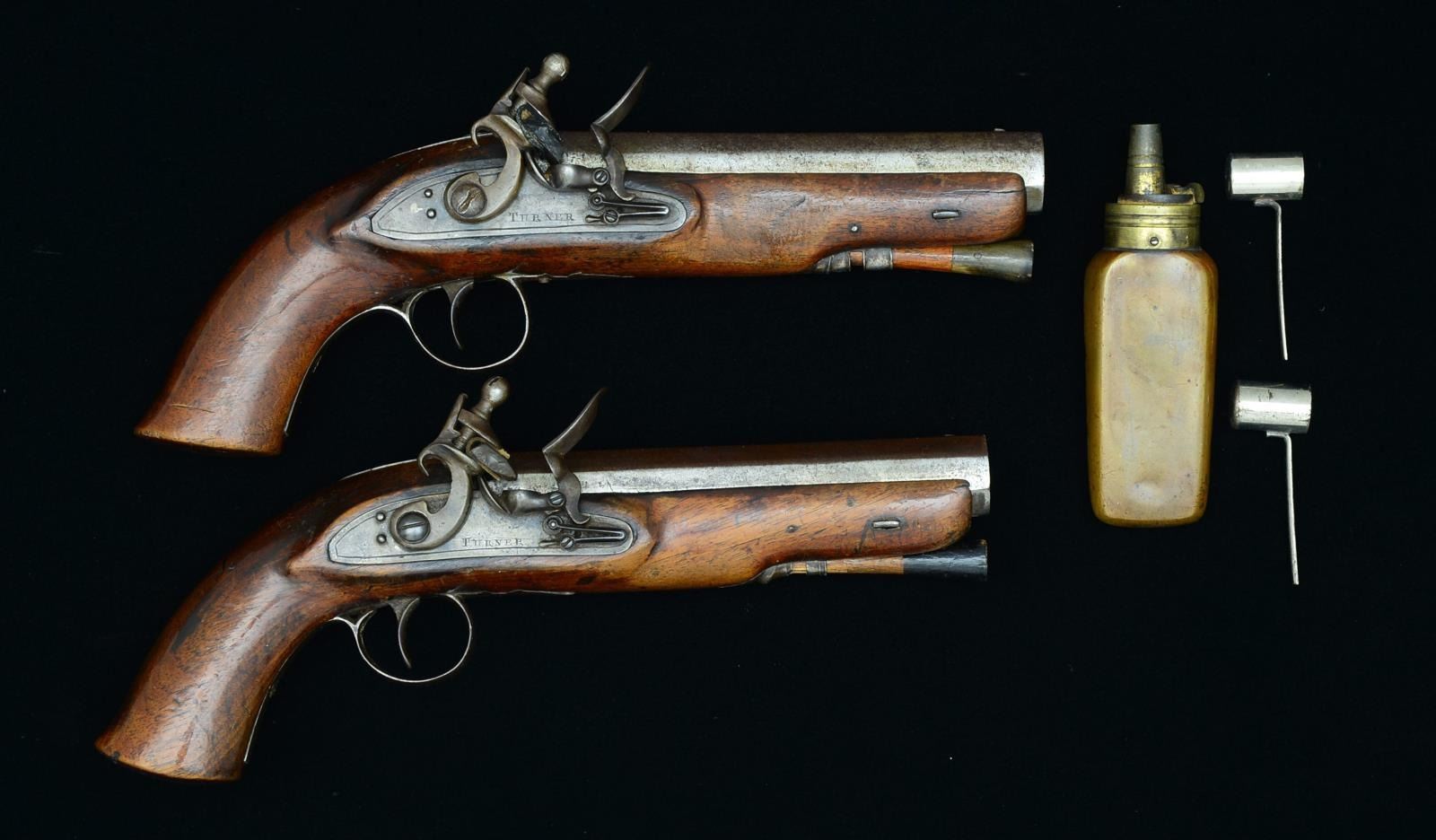 WITH REGISTRATION MARKS BY TURNER. Cal. 66. NSN. Bbl. 5 5/8". Thomas turner is listed as working in Dublin around 1824 & these pistols probably date from around that period. Pistols are 10 1/2" overall. Bbls. are stamped “DUBLIN” on top flats along w/ circa 1843 Kildare county registration marks, "KD 1990" & "KD 1991". Sm. locks w/ flat plates engraved “TURNER” are fitted w/ French style flint cocks, rnd. bodied pans & bridled roller frizzens (rollers are on feather springs which have bulbous finials). Stocks extend w/ in 1/4" of muzzles & are fastened to bbls. w/ side bolts. Stocks have rudimentary iron mts. Trigger guards having acorn shaped finials, no caps are present on grips. Hickory ramrods w/ horn tips mt. through combination pipe/thimbles. UNATTACHED ACCESSORIES: 2 nickel plated powder measures, sm. unmarked copper bodied rectangular powder flask. CONDITION: fair to good, metal parts w/ smooth brown patina. Stocks w/ old hand worn finish. Cocks appear to be old replacements. Mechanically good. One ramrod old replacement w/ painted tip. Accessories are good. (01-19388/MGM). ANTIQUE. $1,200-2,000.