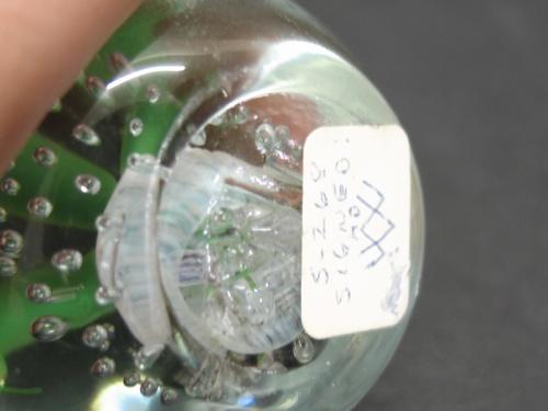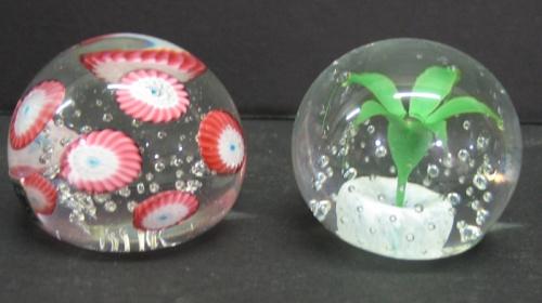 PAIR OF ITALIAN GLASS PAPERWEIGHTS. One is decorated with pink, cream, and blue flowers and is marked with sticker that reads "Venetian-Weil-Murano-Italy". 1.75" H. The other paperweight is decorated with a green plant and is marked on bottom "HD-WV". 2" H