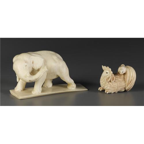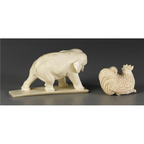 PAIR OF IVORY FIGURES ROOSTER AND ELEPHANT
