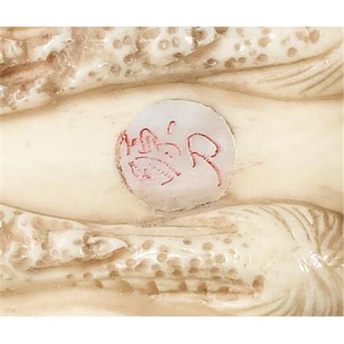 <B>PAIR OF IVORY FIGURES</B></I><BR><BR>Pair of ivory figures: one of a rooster with a small chick, signed to base; the other of an elephant in mid stride and on an ivory base<BR>Rooster: 1.5in. high, Elephant: 2in. high x 3-3/4in. long<BR><BR> <B>Condition Report:</B> Repair to hind foot of elephant.<BR><BR><b>Shipping:</b> Hollowware/Pottery/Glass, Small (<a target="_blank" href="http://www.heritageauctions.com/common/shipping.php">view shipping information</a>)