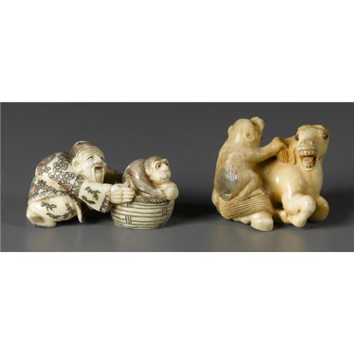 <B>PAIR OF NETSUKE</B></I><BR><BR>Pair of ivory netsuke: one of a seated man with a monkey in a basket, signed to base; the other of a horse and monkey, signed to base<BR>Tallest: 1.5in. high<BR><BR> <B>Condition Report:</B> One with crack to base.<BR><BR><b>Shipping:</b> Hollowware/Pottery/Glass, Small (<a target="_blank" href="http://www.heritageauctions.com/common/shipping.php">view shipping information</a>)