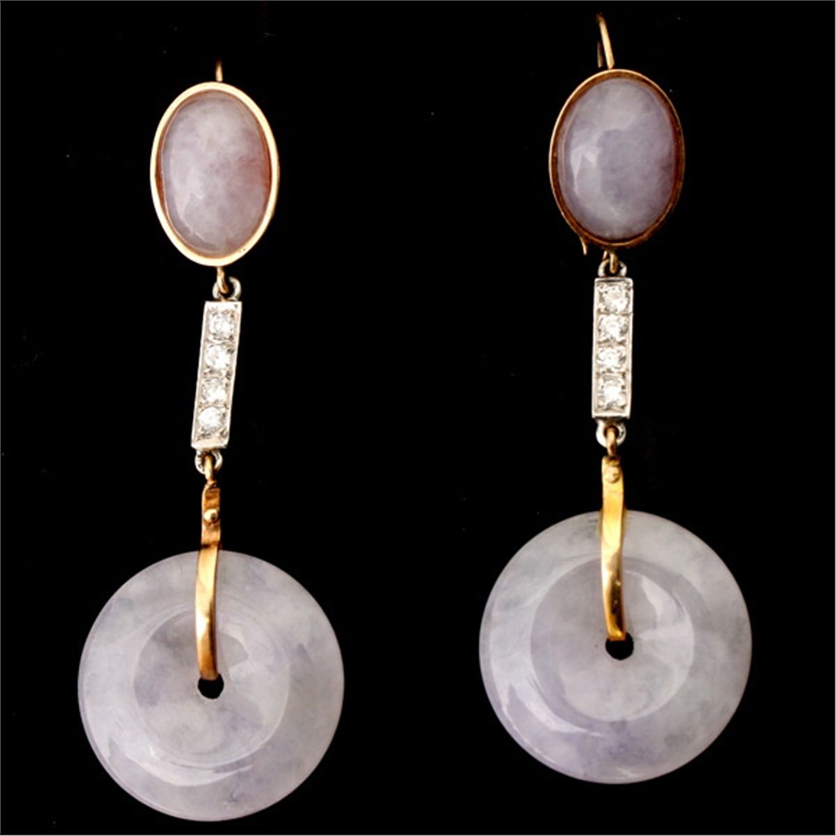 PAIR OF JADE, DIAMOND, 14K YELLOW GOLD EARRINGS. Featuring one oval jadeite cabochon and round disc, accented by four full-cut diamonds weighing a total of approximately 0.08 ct., bezel and bead set in a 14k yellow gold articulated drop style mounting completed by a french wire. 5.10 dwts