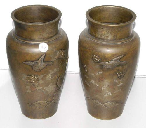 PAIR OF JAPANESE MIXED METAL VASES, 9" high