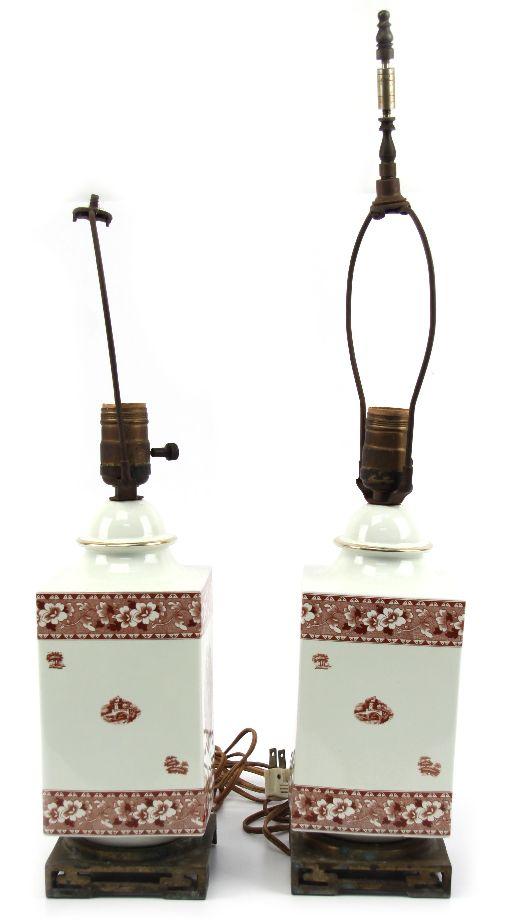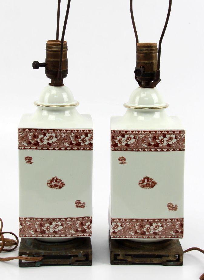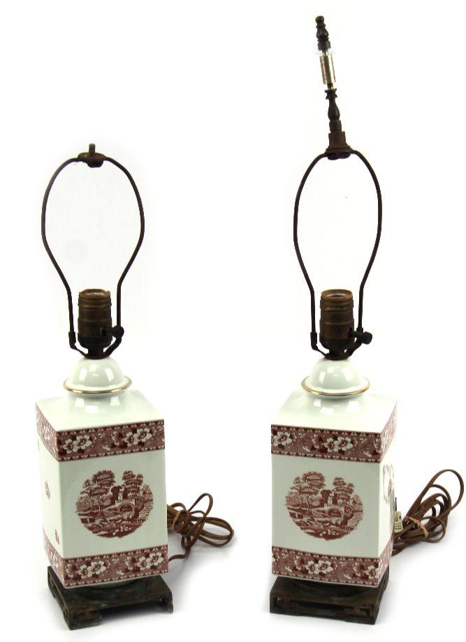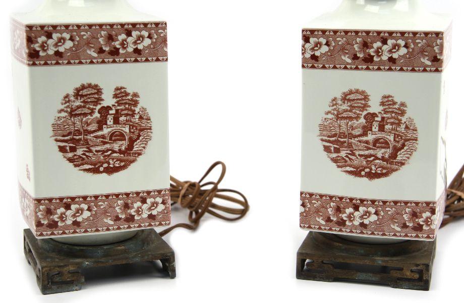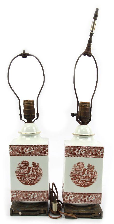 24 inches in height with a 4.25x4.25 inch brass base. Red and white English transferware porcelain lamps with castle scenes and floral borders. Good condition with one lamp missing finial and some losses to metal base. Toning and watermarks to the shades.