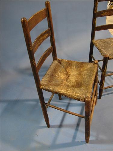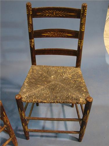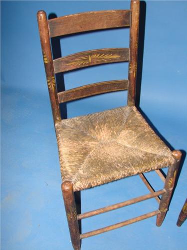 PAIR OF PAINT DECORATED LADDER BACK CHAIRS. Rush bottom seats. Decorated with dark blue paint and yellow stenciled paint. Both show loss to paint. One chair is missing bottom support at left side. 34.5” H to top of back, 17” W, 14” D