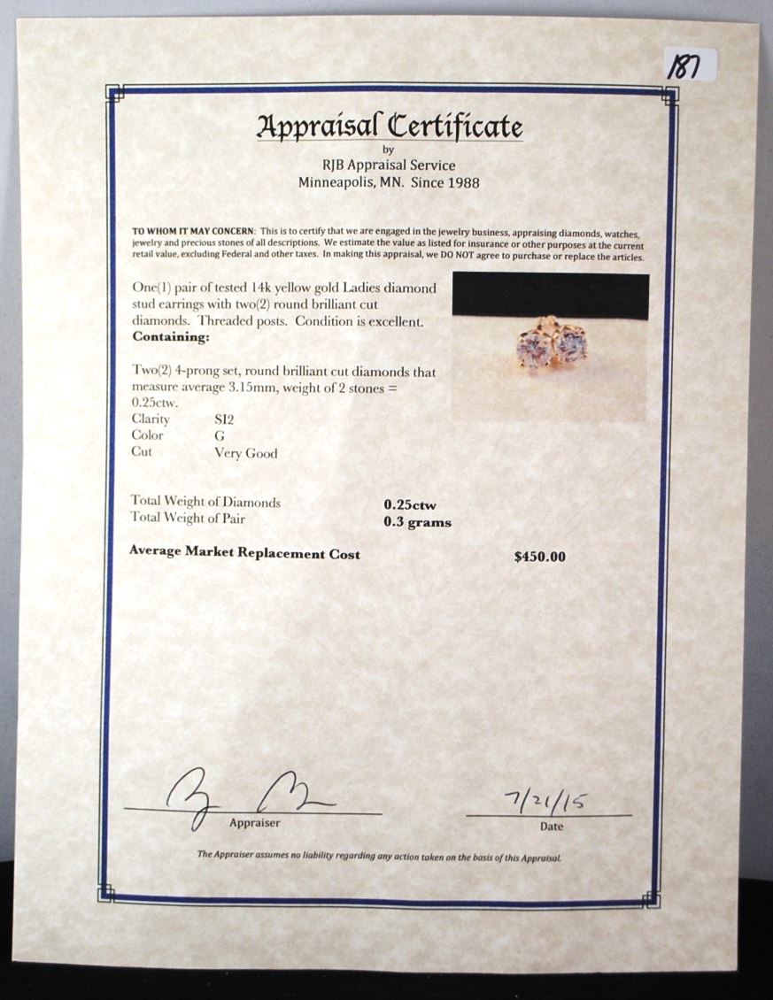 PAIR OF TESTED 14K YELLOW GOLD LADIES DIAMOND STUD EARRINGS WITH TWO 4-PRONG SET, ROUND BRILLIANT CUT DIAMONDS THAT WEIGH 0.25CTW, SI2 CLARITY, G COLOR. THE AVERAGE MARKET REPLACEMENT IS $450.00. AND COMES WITH THE