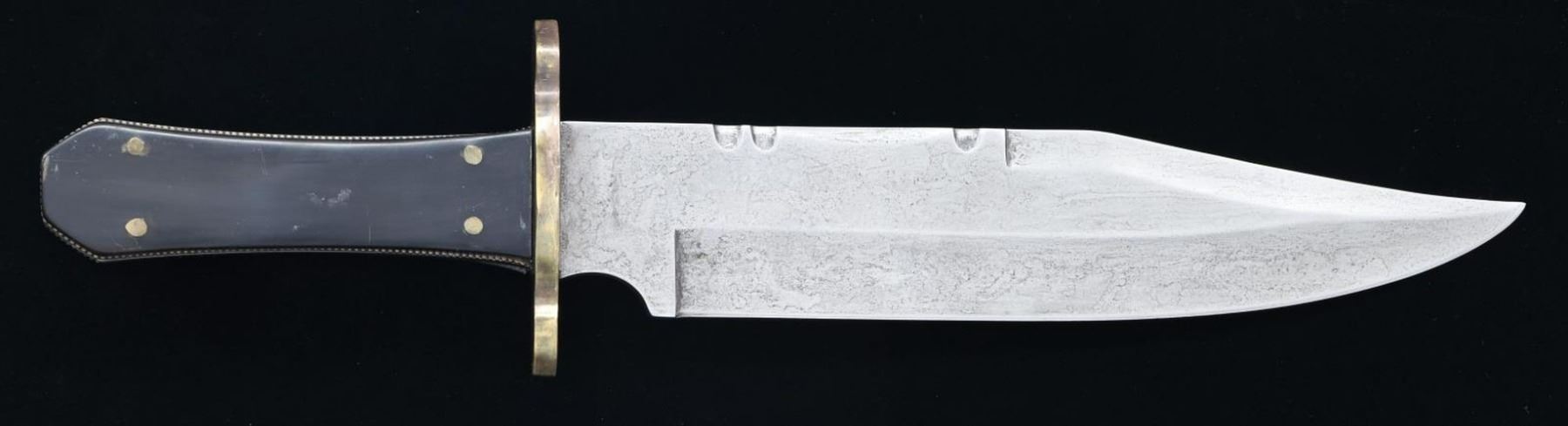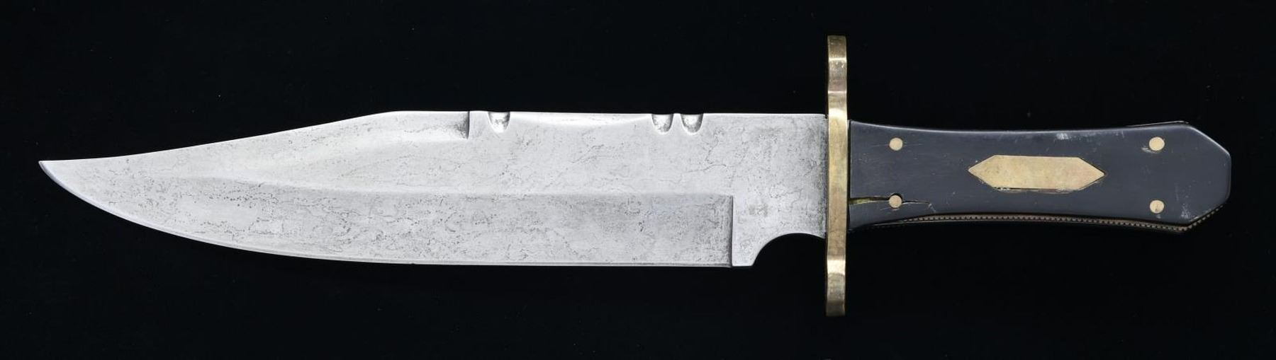 1) 19” overall, 12” clip point blade, nickel plated crossguard and ferrule, sculpted pseudo birdshead wood grip, appears of Mexican origin. CONDITION: Good to very good overall 2) 14” overall, 9.5” clip point blade, full tang, horn slab grips, heavy sculpted brass cross guard. CONDITION: very good overall, one slab has crack at one of 4 brass pins. (02-21003, 21015/JS) $300-400.