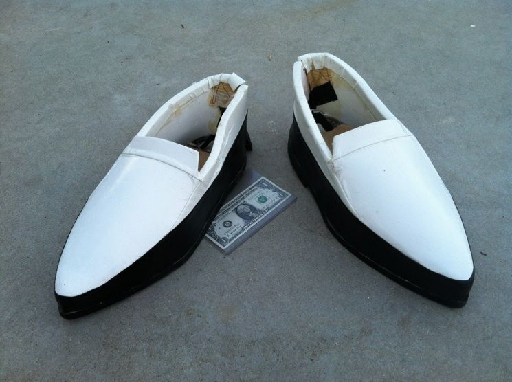 This is a pair of large mascot costume shoes. The right shoe is missing a heel, but otherwise good.