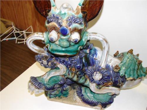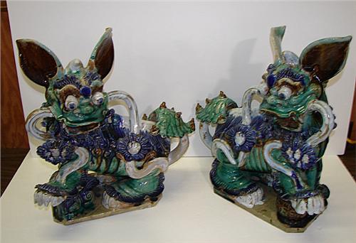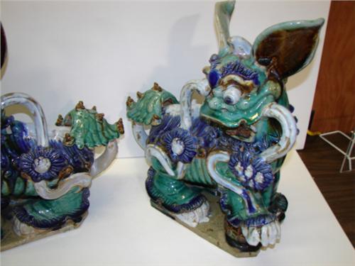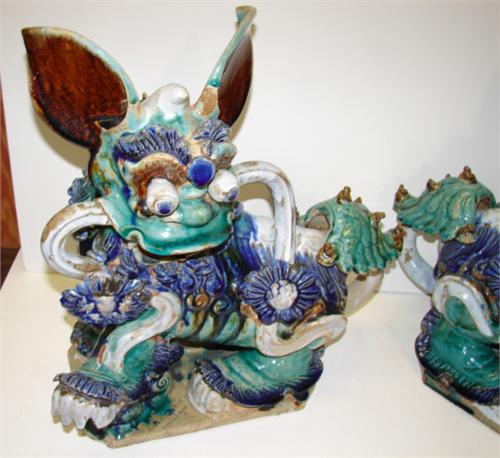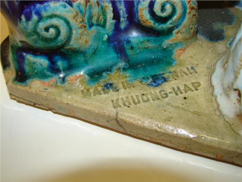 PAIR OF LARGE SOUTHEAST ASIAN FOO DOGS. Brown, cobalt blue, and green glaze. Stamped on base “Made in Vietnam/Khuong-Hap”. 18.25” H