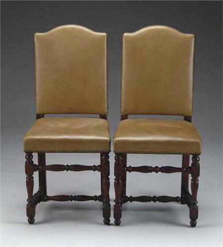 PAIR OF LEATHER UPHOLSTERED 18TH CENTURY SIDE CHAIRS. Nice turned front legs and stretchers. The light brown leather over-upholstered seat has matching over-upholstered back. Decorated with brass upholstery tacks. Serpentine top back rail. SIZE: 38-1/2” h x 18-1/2” seat h. CONDITION: Generally very good. 9-27978