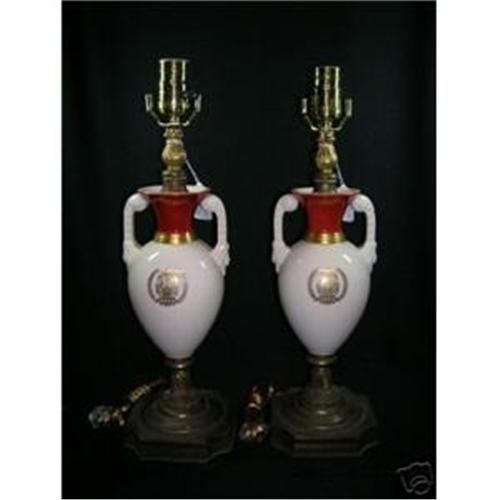 This is a beautiful pair of Antique Lenox Belleek Handled Urn Shaped electric table lamps manufactured by Lenox of Trenton, NJ circa 1920's. The decoration is in red and gold on an ivory color ground. This is an elegant design in gold of a Lyre surrounded with laurel leaves. A beautiful piece! The Urn shaped body is placed on a brass stand. The handles are beautiful with a woman's face at the bottom. One lamp handle has been repaired and difficult to see except on close inspection. I have seen this exact model lamp before with the bottom made of porcelain/pottery and marked with the Belleek mark. This pair of lamps is marked on the bottom of each porcelain piece with a stock number which is hidden by the brass base. This lamp was probably made late in the period when Lenox was involved in a lawsuit about the Belleek mark and that designation was deleted from their products. This lamp is 11-1/2" tall to the top of the porcelain and 17-1/2" to the top of the socket. The brass base is 5" square with a greek key design around the bottom and acanthus leaves at the pedestal. The lamp has been rewired and is ready to be put to use. There is no other damage to this beautiful pair.