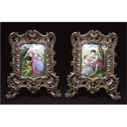 PAIR OF LIMOGES ENAMEL PLAQUES, each painted in colours by CSK, signed, with a courting couple in a woodland setting, the elaborately moulded scrollwork frames detailed in amethyst translucent enamel,