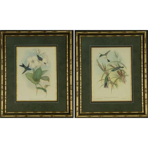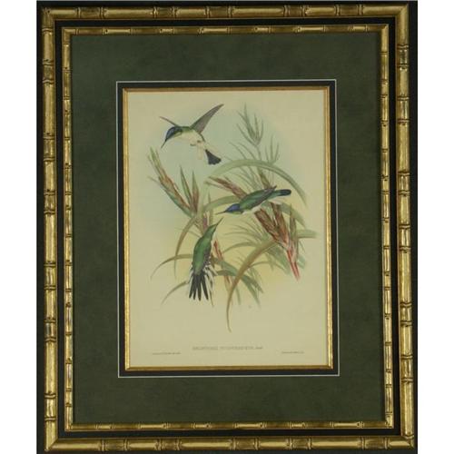 PAIR OF HANDCOLORED LITHOGRAPHS 18'' x 13'', John H. Goulds (1804-1881) & H. Const. Richter (1821-1902), British. ''Thalurania Refulgens'' & ''Heliothrix Purpureiceps''. Title and publishing info. bottom center, left and right. Placed in contemporary faux bamboo frames with double matting and gold trim. More info. in the white binder.