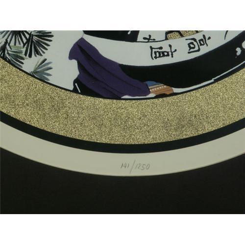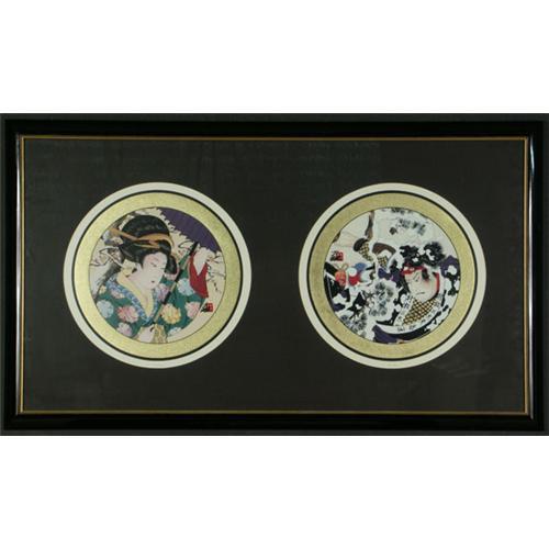 PAIR OF OFF-SET LITHOGRAPHS WITH METALLIC ACCENTING 13'' x 13'' (each circular image), 19 1/2'' x 20 1/2'' (total image area with matting), Otsuka. A Geisha and a Samuari. Unsigned. Numbered 141/12500 lower center. Matted and placed together in a black frame with gold trim.