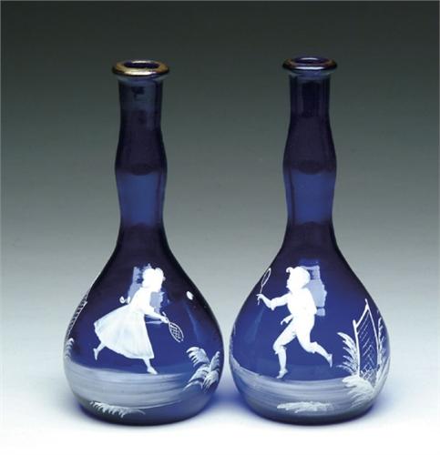 PAIR OF MARY GREGORY TYPE BARBERS BOTTLES. Nice pair of Mary Gregory type barber bottles is cobalt blue glass with white enameling of two children playing badminton. Bottles trimmed at opening with gold enameling. SIZE: 8-1/4 in. t. CONDITION: Some wear to the gold, otherwise very good to excellent. 5-60266