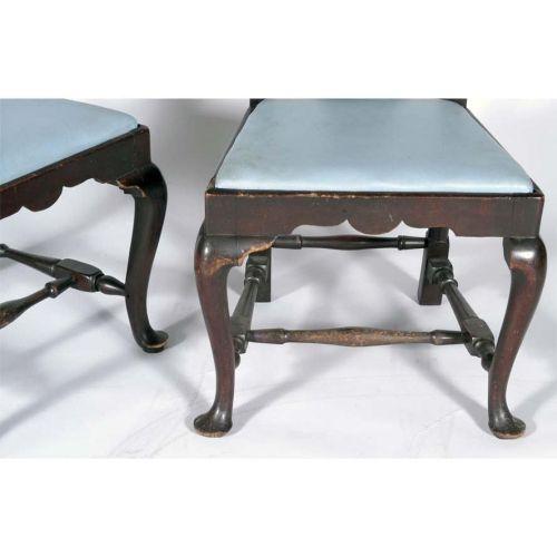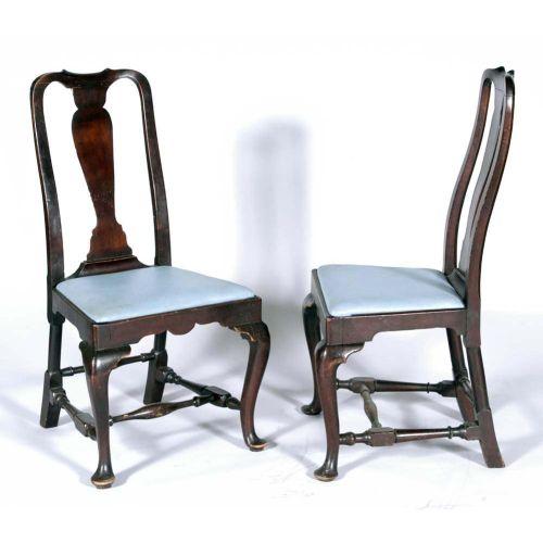 PAIR OF MASSACHUSETTES QUEEN ANNE MAPLE SIDE CHAIRS in old surface with one original seat frame, ca. 1740 one adapted from an armchair, other with repair wear the splat had broken away from crest.