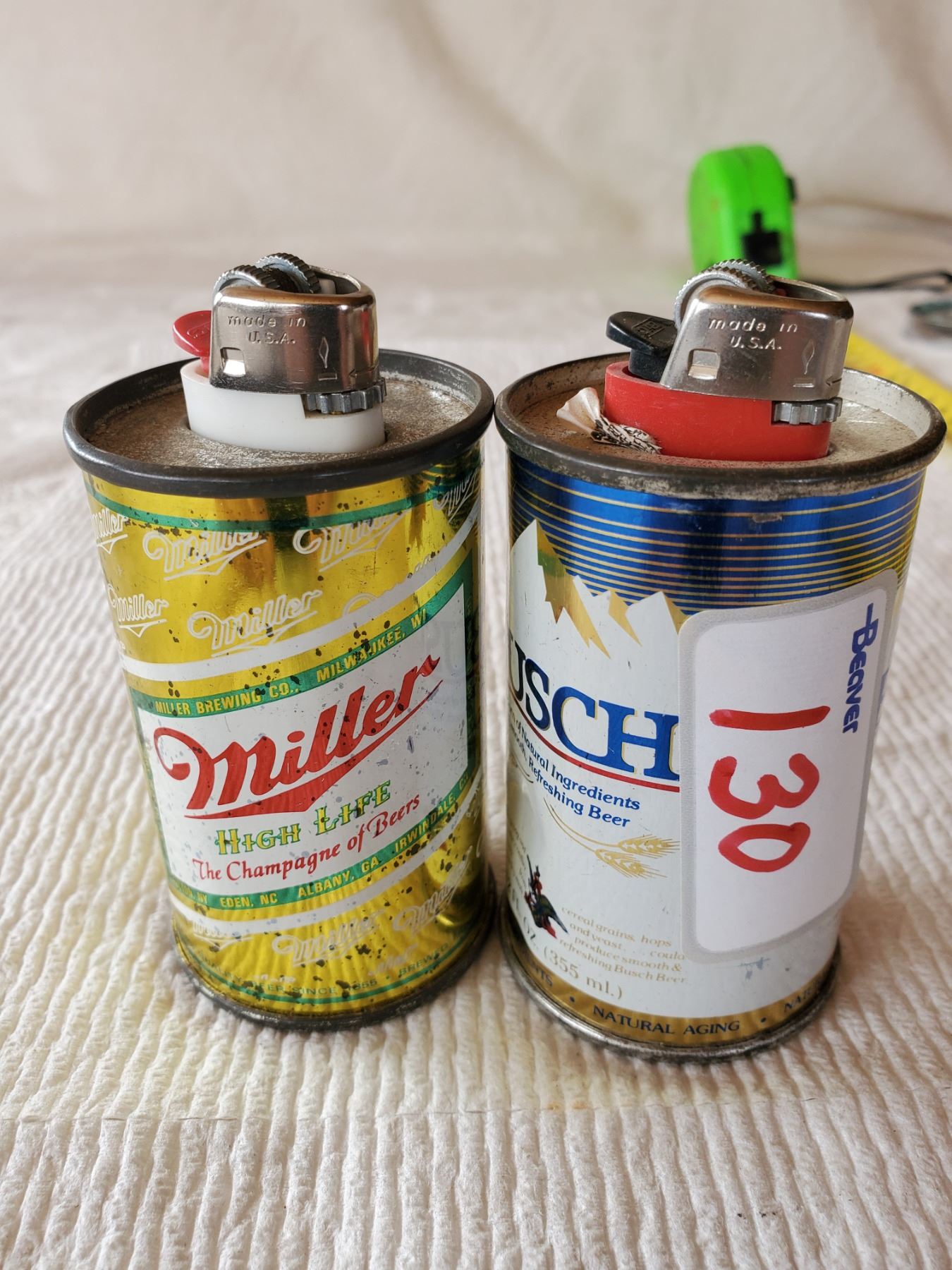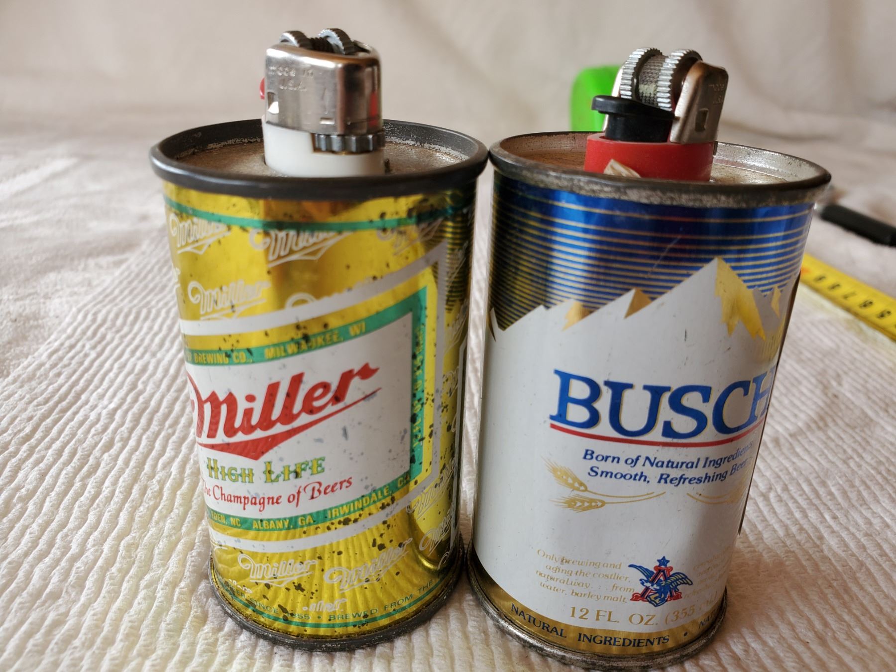 PAIR OF MINIATURE BAR ROOM BEER CAN LIGHTER HOLDERS- BUSCH & MILLER