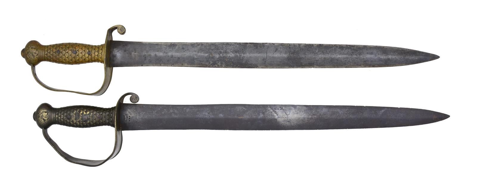 1) “USN / 1843 /NWP” & “N.P. AMES / SPRINGFIELD” marked on ricasso. CONDITION: good to very good, dark blade w/ pitting, good markings, guard has several binds & dents, dark patina. 2) “N. P. AMES / CABOTVILLE” marked on ricasso, “1848” dated. CONDITION: good to very good overall, dark blade w/ pitting, date & inspector only partially discernible, guard w/ rack numbers, dark mustard patina. (02-14303/JS). $700-900.