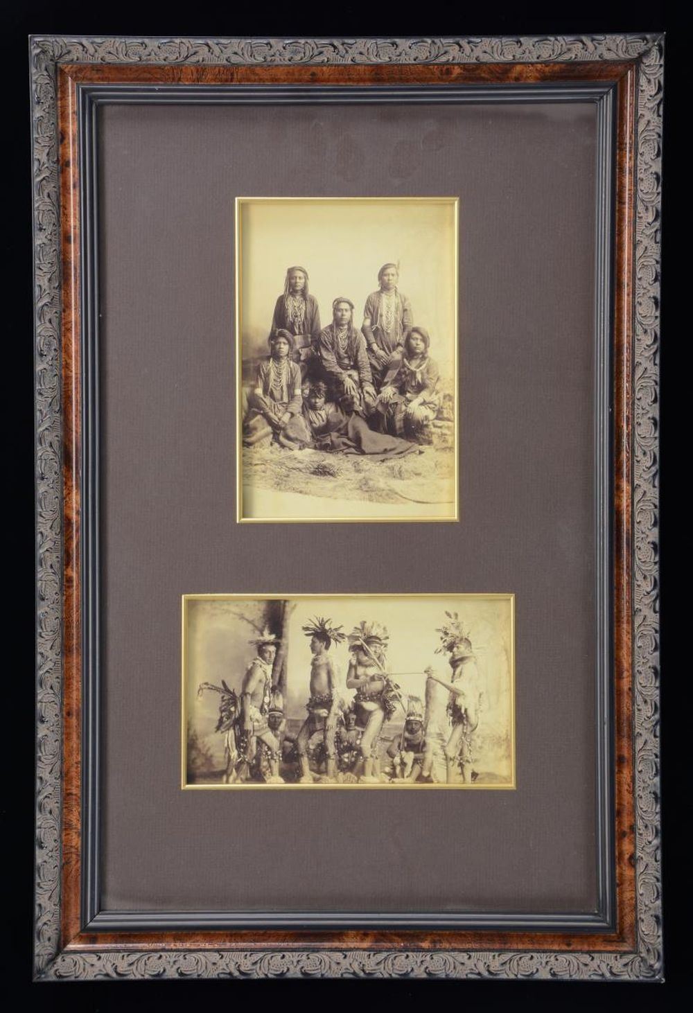 FRAMED. Both images 7" x 4" exposed under matting, one view is of a Native American family and the other is a group of warriors with feathered head dresses and war paint. UNATTACHED ACCESSORIES: descriptive sheet. CONDITION: appears fine, not removed from frame. PROVENANCE: from Martin Lane Historic & Western Americana Lifetime Collection. (02-21501/JS). $400-600.