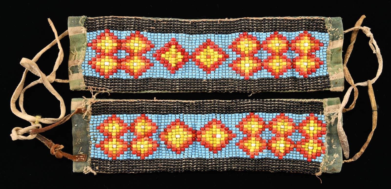 9" x 3" beaded panels on larger heavy green & white cotton cloth with rawhide ties. Red, orange, yellow, & white beads sewn on turquoise ground with black borders. CONDITION: good overall, beads appear complete. (02-19341/JS). $200-400.