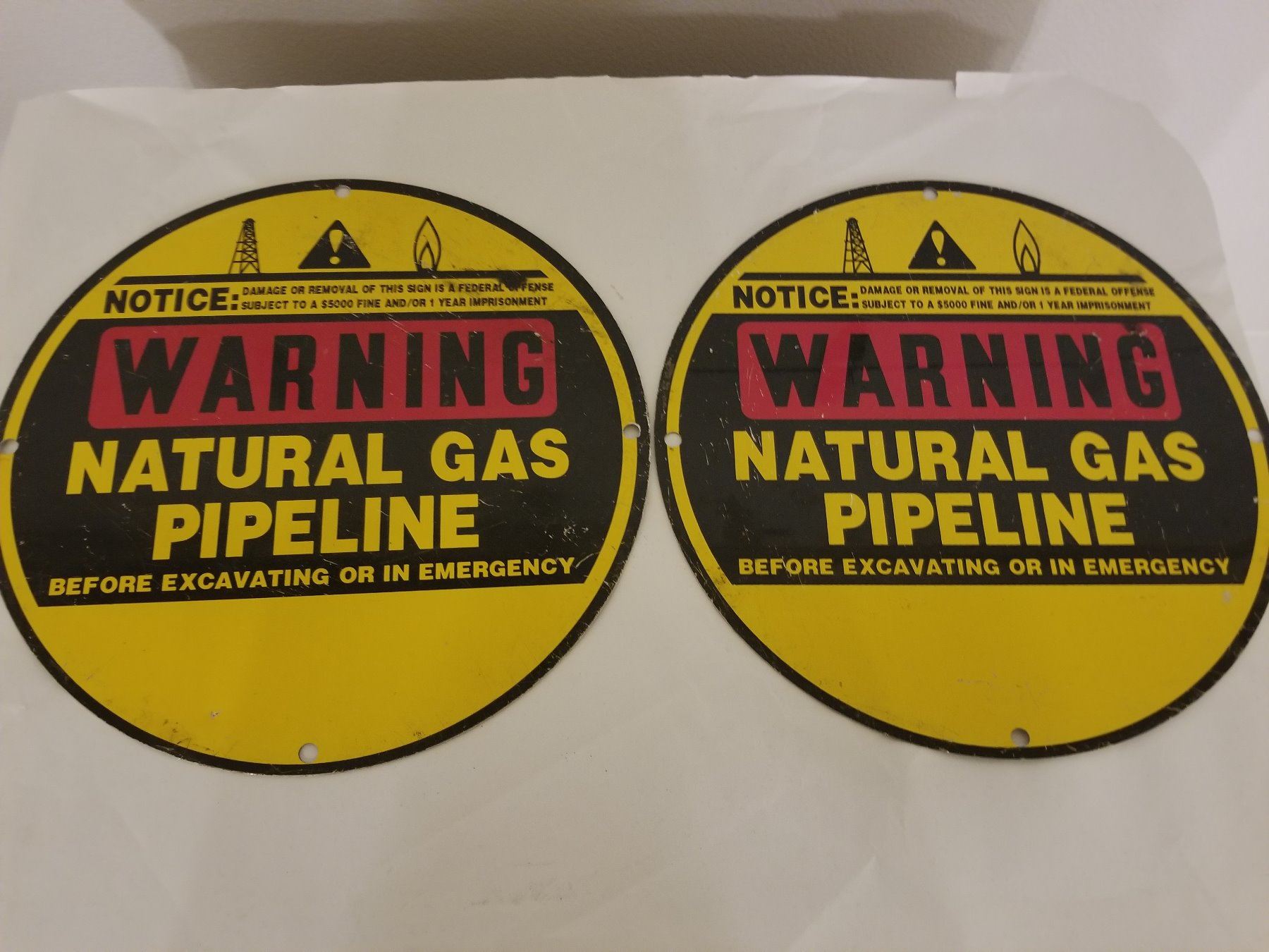 PAIR OF NATURAL GAS PIPELINE CROSSING SIGNS *UNUSED 12"*
