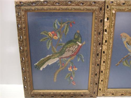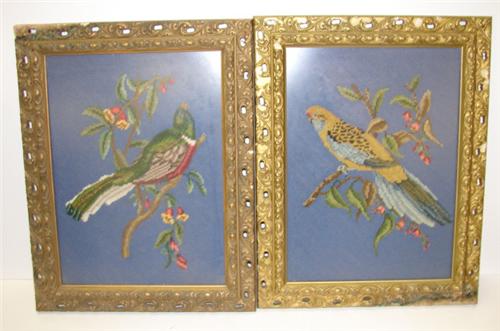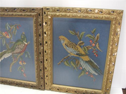 PAIR OF NEEDLEWORK PRINTS OF TROPICAL BIRDS. Both prints are in gilt gesso & wood frames. Frames show loss to gilt and gesso. 14.5” x 18.5”