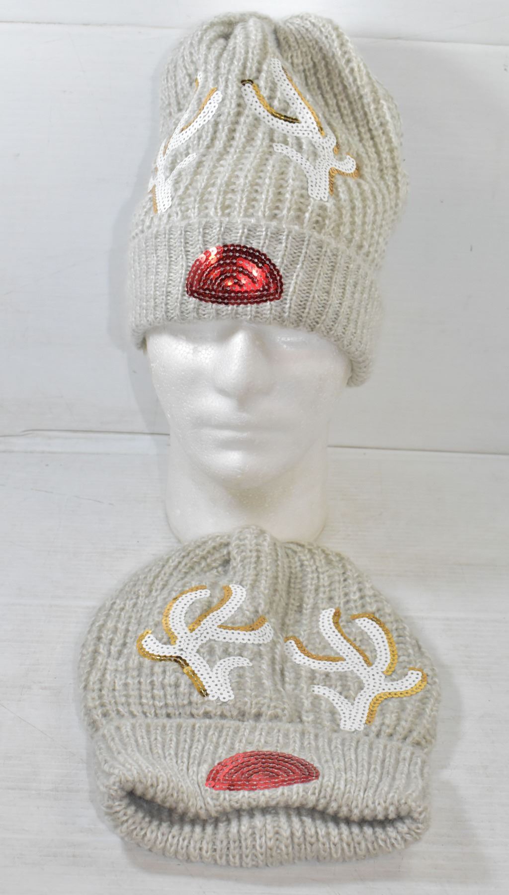 WINTER HAT WITH REINDEER ANTLERS AND RED NOSE DESIGN, LIGHT GREY IN COLOR