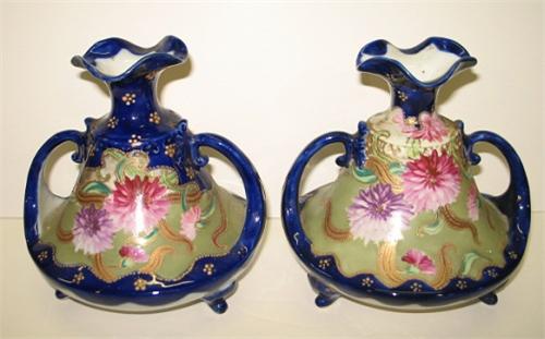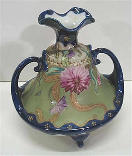 PAIR OF NIPPON STYLE DOUBLE-HANDLED EWERS. Hand painted floral and gilt jeweled decorated. Each ewer rests on three feet at base. Unmarked. 7" H