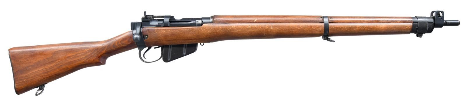 1) LONG BRANCH NO. 4 MK I*. Cal. .303 British. S# 39L6249. Bbl 25". Stamped "No 4 Mk I */ LONG BRANCH/ 1943" on the left side of the receiver. Major metal components are blued, with the buttplate and magazine exhibiting a black enamel finish. Stock and handguard are comprised of solid wood. Matching numbers are on the receiver, bolt, and magazine. CONDITION: metal components retain the majority of their arsenal blue finish, exhibiting mild wear overall, with areas of oxidation present on the front barrel band and nose cap. Mirror bore, exhibiting well defined rifling throughout. Wood furniture shows a few scattered handling marks, but is otherwise very good. 2) SHTLE NO. III* WITH RAF MARKED BAYONET. Cal. 303 British. S# S105. Bbl 25". SHTLE No. III* manufactured in 1918 at the Enfield arsenal. Right side of receiver bears stampings stipulating the manufacturer, year of manufacture, and model designation. Underside of buttstock bear a 6 pointed star over "E" proof. Metal components are blued, with the furniture being comprised of solid wood. Bayonet is stamped with a crown over "GR/ 1907/ WILKINSON" on the ricasso, with "RAF" stamped on the pommel and right wood grip. CONDITION: metal components retain large amounts of their arsenal blue finish, exhibiting areas of wear and thinning overall, with some scattered areas of pitting. Bright bore, exhibiting what appears to be either mild pitting or some old grease within the grooves, and retaining strong rifling throughout. Stock shows scattered marks from handling and storage, with a couple losses on the right side around the trigger guard. Bayonet retains good amounts of its arsenal blue finish, exhibiting wear and thinning that shows through to gray patina, with some scattered spots of pitting. Scabbard shows wear, but remains sturdy and serviceable. (23-2413 & 23-2423/MLW) BOTH CURIO. $600-800.