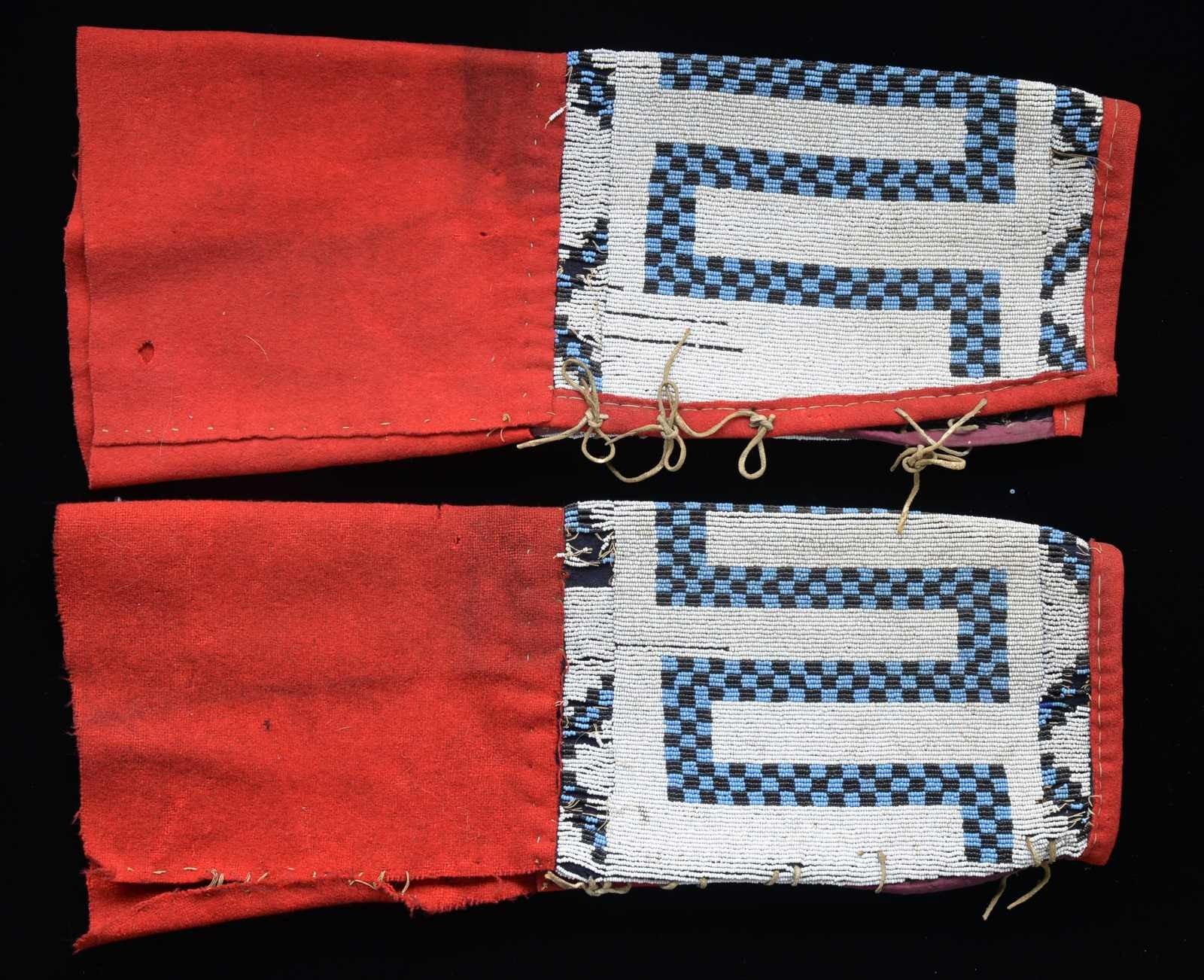 18" Overall w/ a 10" x 8" beaded panel on red trade cloth. Sewn w/ cotton thread, beaded decoration is black & sky-blue beads in Greek key design on white ground. CONDITION: fair overall, loss of beads especially on edges as can be seen in photos, trade cloth is stained w/ scattered insect damage (02-14577/JS). $800-1,200.