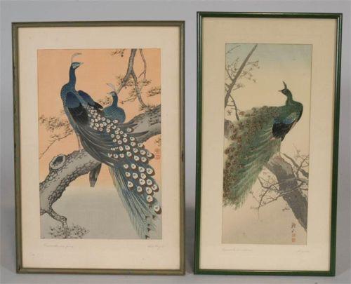 PAIR OF OHARA KOSON WOODBLOCK PRINTS 14"x9" sight and 14 1/2"x6" sight, both matted and framed, CONDITION: minor foxing to peacock. PACKING AND SHIPPING BY FAIRFIELD AUCTION WITHIN CONTINENTAL USA (excluding insurance) $40,