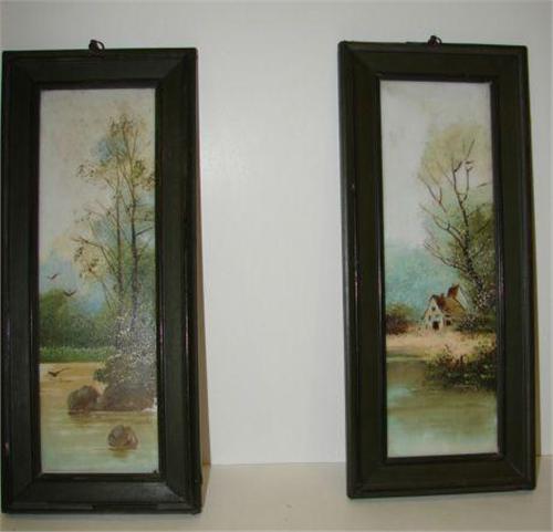 PAIR OF OIL ON PORCELAIN PAINTINGS. One depicts a pond and forest shoreline scene and the other depicts a pond and forest shoreline scene with cottage. Unsigned. 5.75” x 13.75” framed.