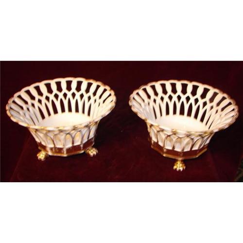 Circa 1870 Pair of French Old Paris Reticulated White Fruit Compotes with nice gilding on the feet and bottom outside of Wonderful Oval Shaped Serving Pieces. You would often find these sitting on a sideboard filled with fruit in Savannah,Charleston, Atlanta, New Orleans and Mobile and other great Southern Cities in the United States. The gilding is worn enough to show the character and richness of this fine pair. No Damage or Restoration. Perfect Condition. They measure 5" in height and 9 1/4" in diameter.