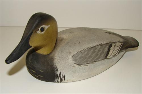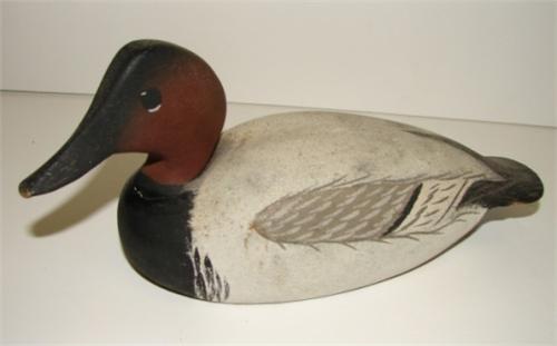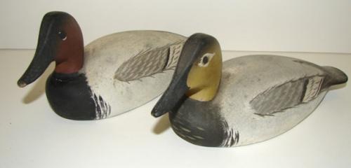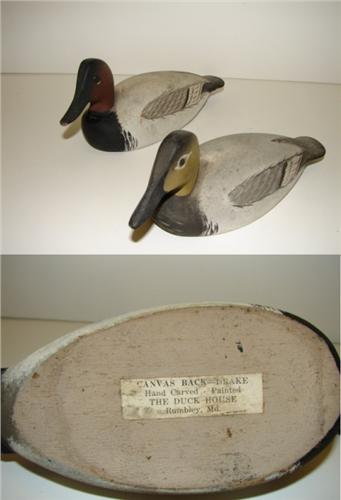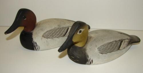 PAIR OF OLIVER “TOOTS” LAWSON HALF-SIZE CANVASBACK DECOYS. Consists of drake and hen. Both have turned heads. Paper label on bottom of drake reads “CANVAS BACK-DRAKE/Hand Carved-Painted/THE DUCK HOUSE/Rumbley, Md.” Hen retains partial label on bottom. Bill on drake shows minor damage. Small area of paint on neck of drake has been touched up. 7.75” L