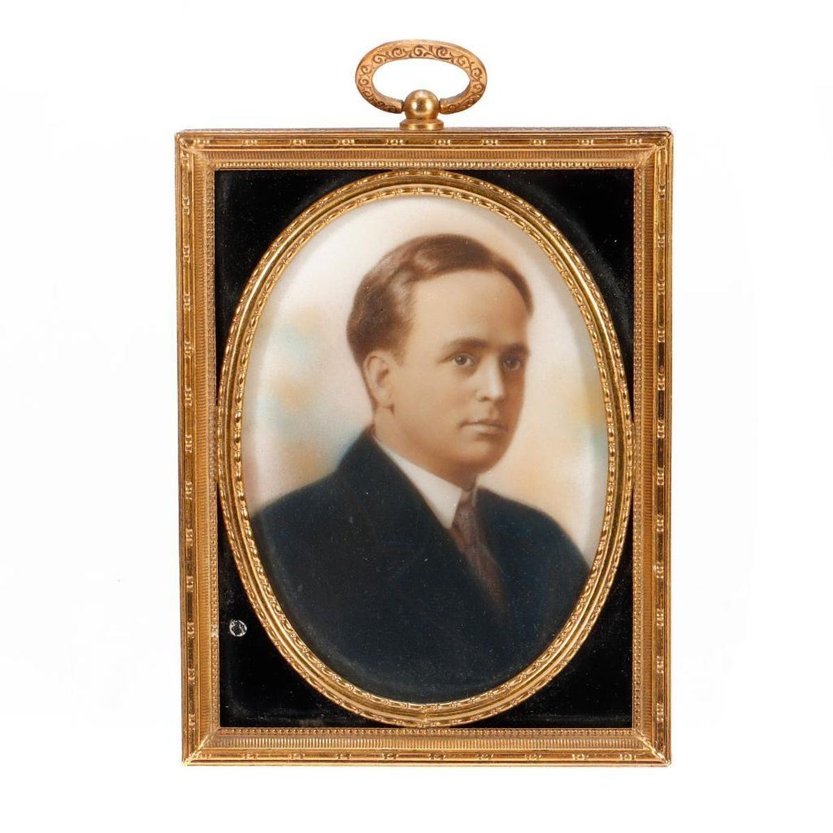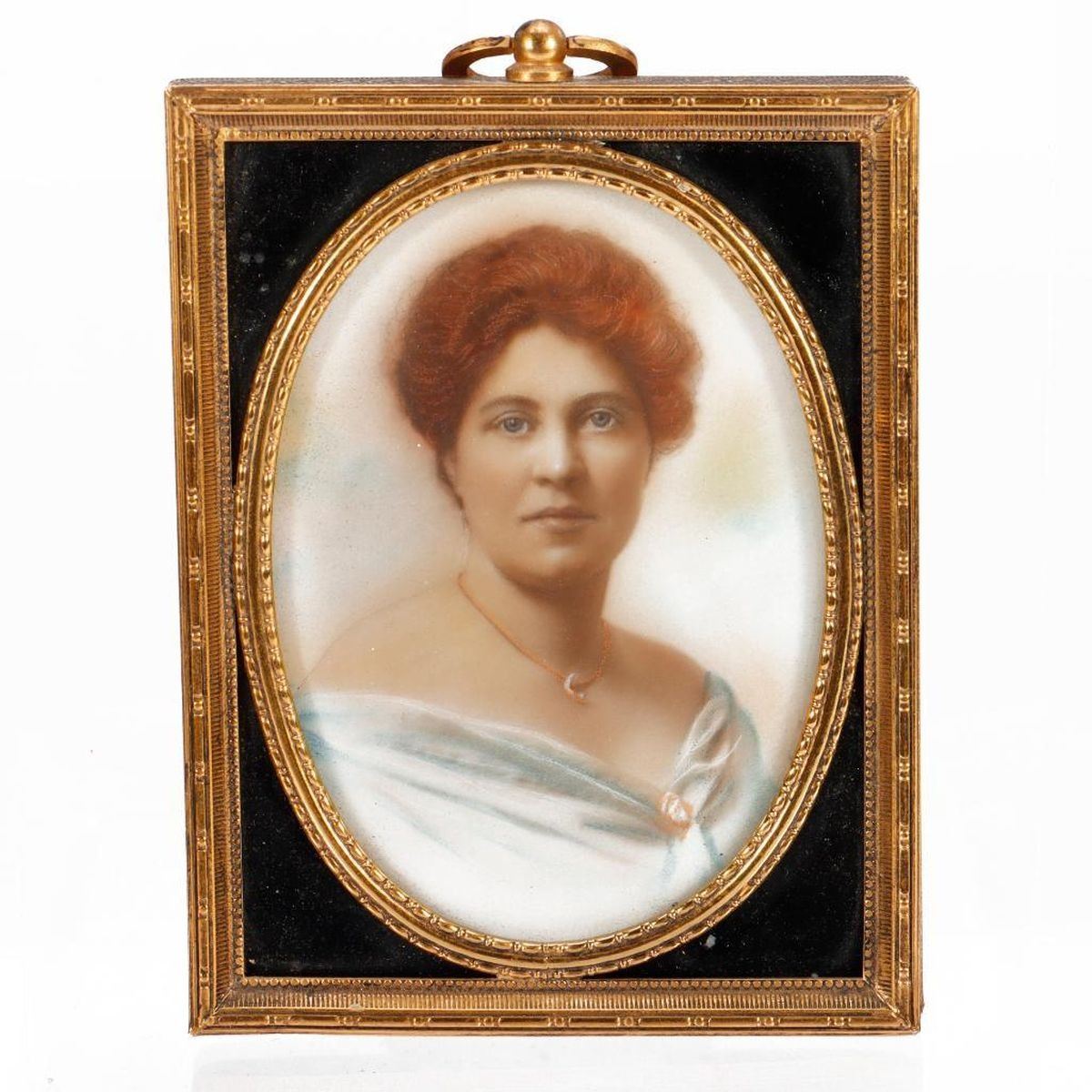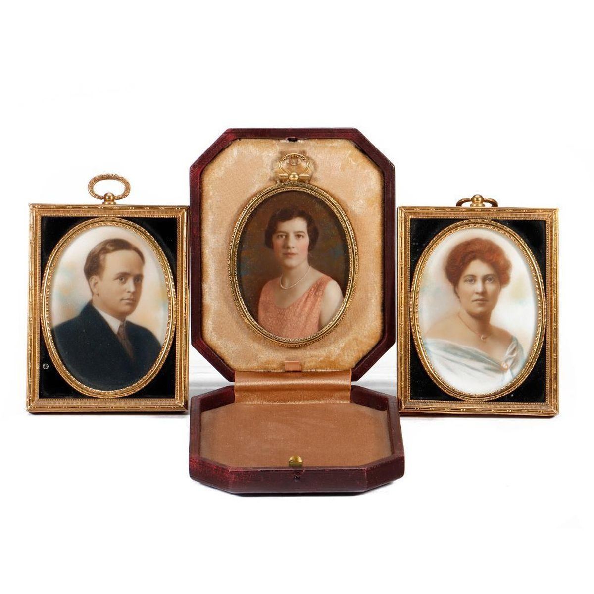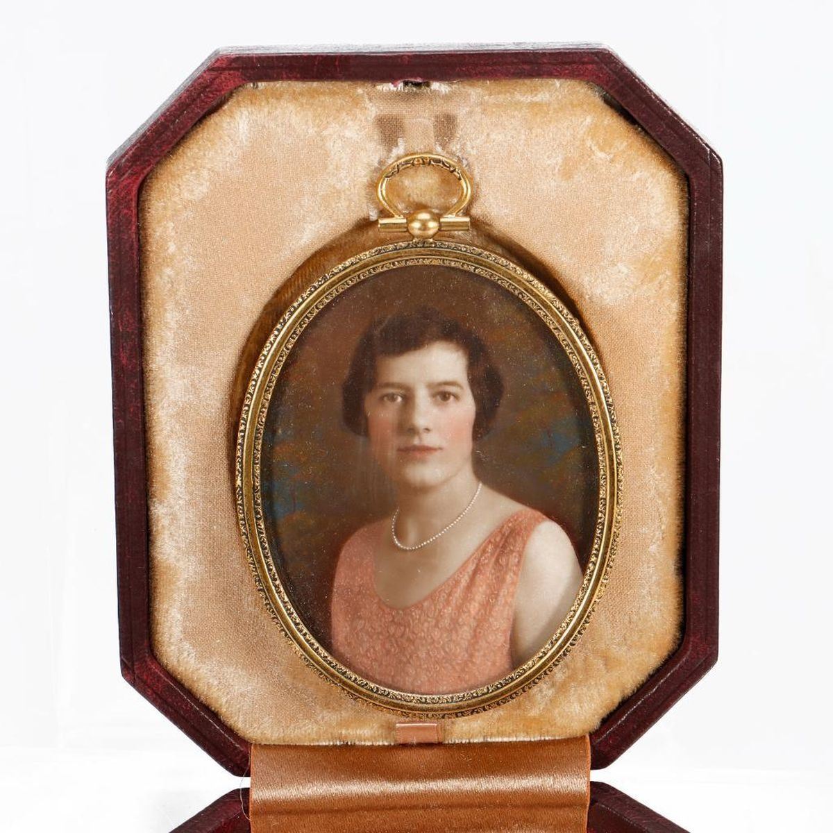 A pair of c. 1910s hand-tinted opalotype milk glass portraits, showing a man and woman, in matching gold metal frames. 4 3/8in. x 3 3/8in. Good condition. Together with a c. 1920s hand-tinted photograph of a woman in an oval gold metal frame, set into a fitted silk- and velvet-lined leather case. 3 3/8in. x 2 1/8in.; 5 3/8in. x 4 1/4in. (case). Good condition. This lot and the other Chapman-related items offered in this sale were part of a collection of papers and ephemera related to the Edward Mortimer Chapman (1862-1952) family, including his first wife Isabel Northrop Chapman (1864-1920), and second wife, Louise Wadsworth Jones Chapman (1873-1959). Edward M. Chapman was a Connecticut pastor, academic, and author, and a descendant of Robert Chapman, one of the first settlers of Saybrook, Connecticut (c. 1635).