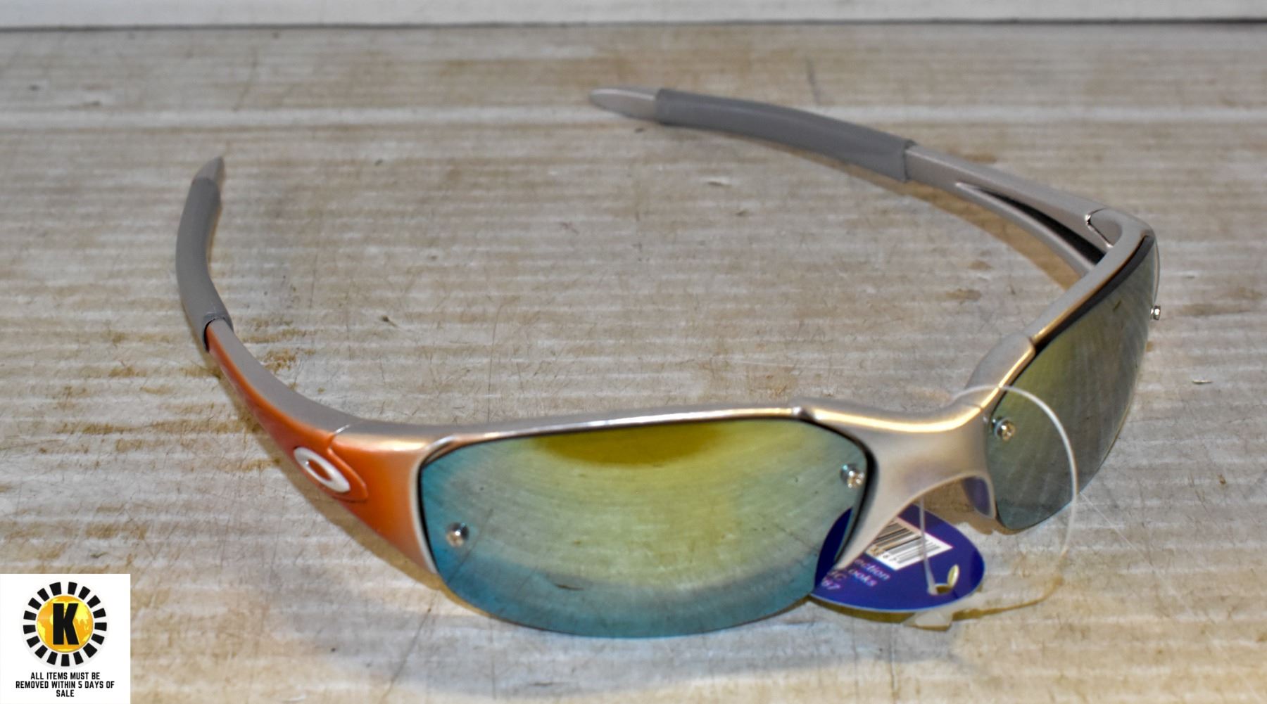 PAIR OF ORANGE AND GREY OAKLEY REPLICA SUNGLASSES WITH UV400 PROTECTION. ALL ITEMS MUST BE REMOVED WITHIN 5 DAYS OF SALE