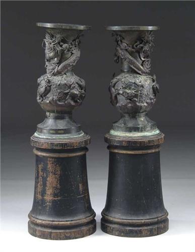 PAIR OF ORIENTAL BRONZE VASES ON WOOD STANDS. The antique vases are made in three sections, which are bolted together. The body adorned with serpent, foo dog and bird decoration in relief. The carved wood hub type tapered bases are antique also. Probably 19th Century. Vases have open bottom. May have held lamp font. PROVENANCE: Form a fine Brunswick, Maine Estate. SIZE: Vases are 21-3/4” h; total is 41-3/4” h. CONDITION: One base section is detached but present. Weathered and cracked pedestals with some large chips. 9-27481