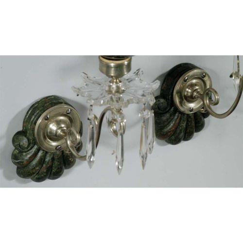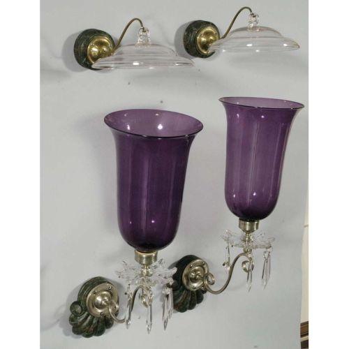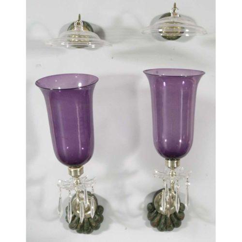 PAIR OF PAK TONG HURRICANE CANDLE LAMP SCONCES with amethyst shades and smoke bells, age uncertain, shell form backs are not original, CONDITION: excellent,