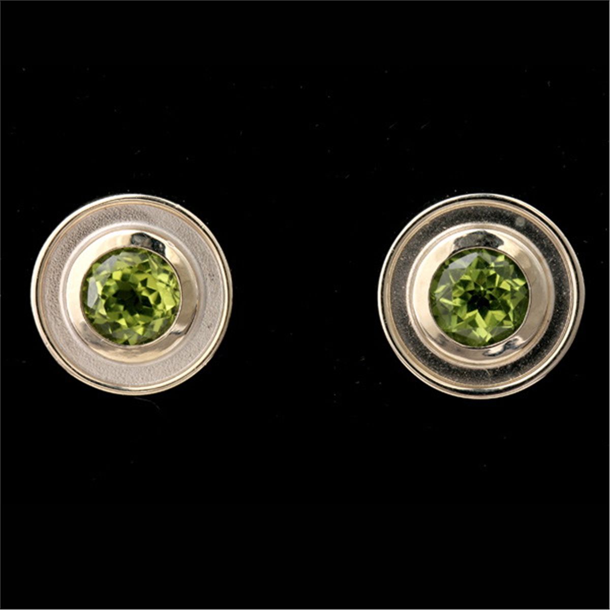 PAIR OF PERIDOT, 14K WHITE GOLD EARRINGS. Each centers one round-cut peridot weighing approximately 2.80 cts., bezel set in a 14k yellow and white gold frame mounting completed by a post and friction back. 4.30 dwts